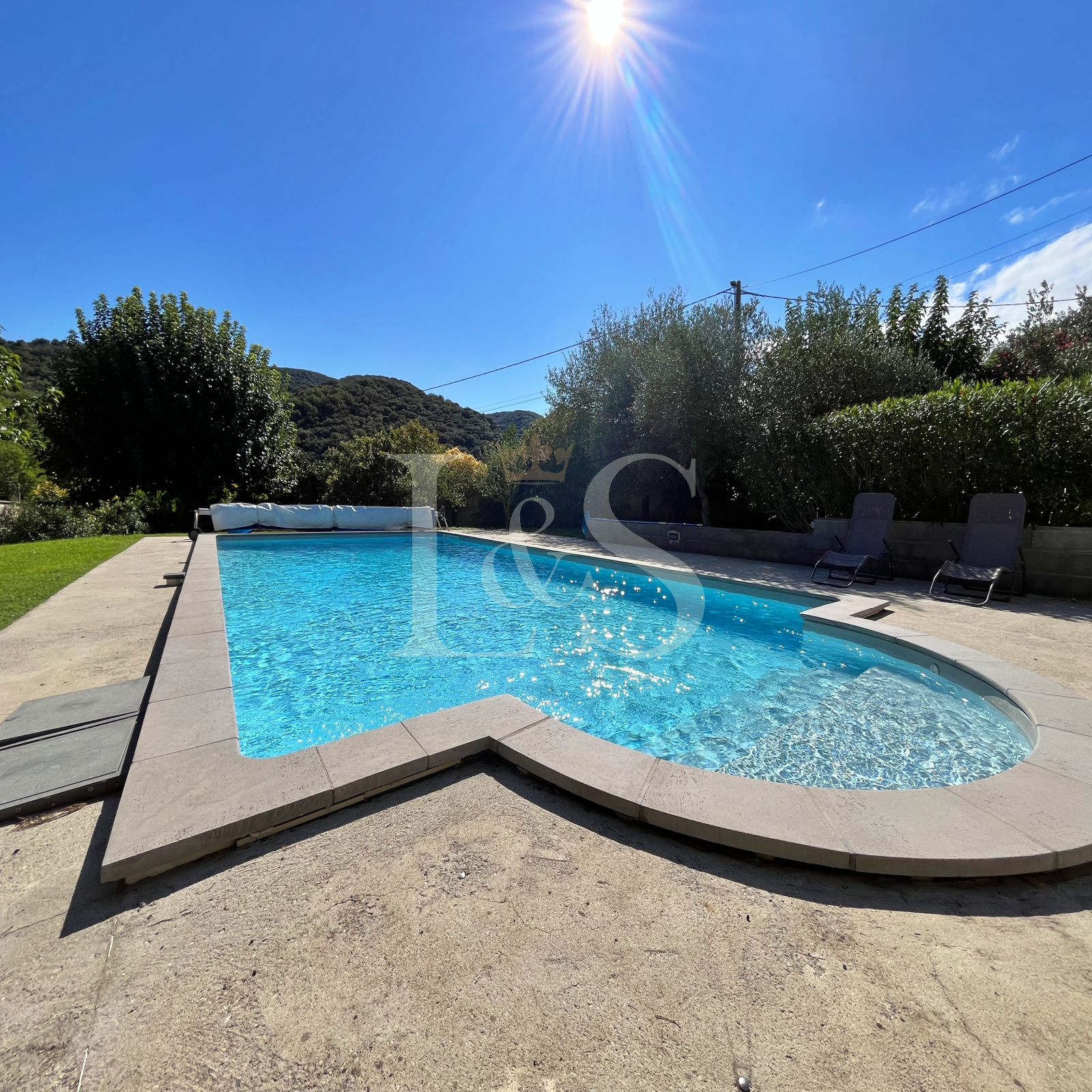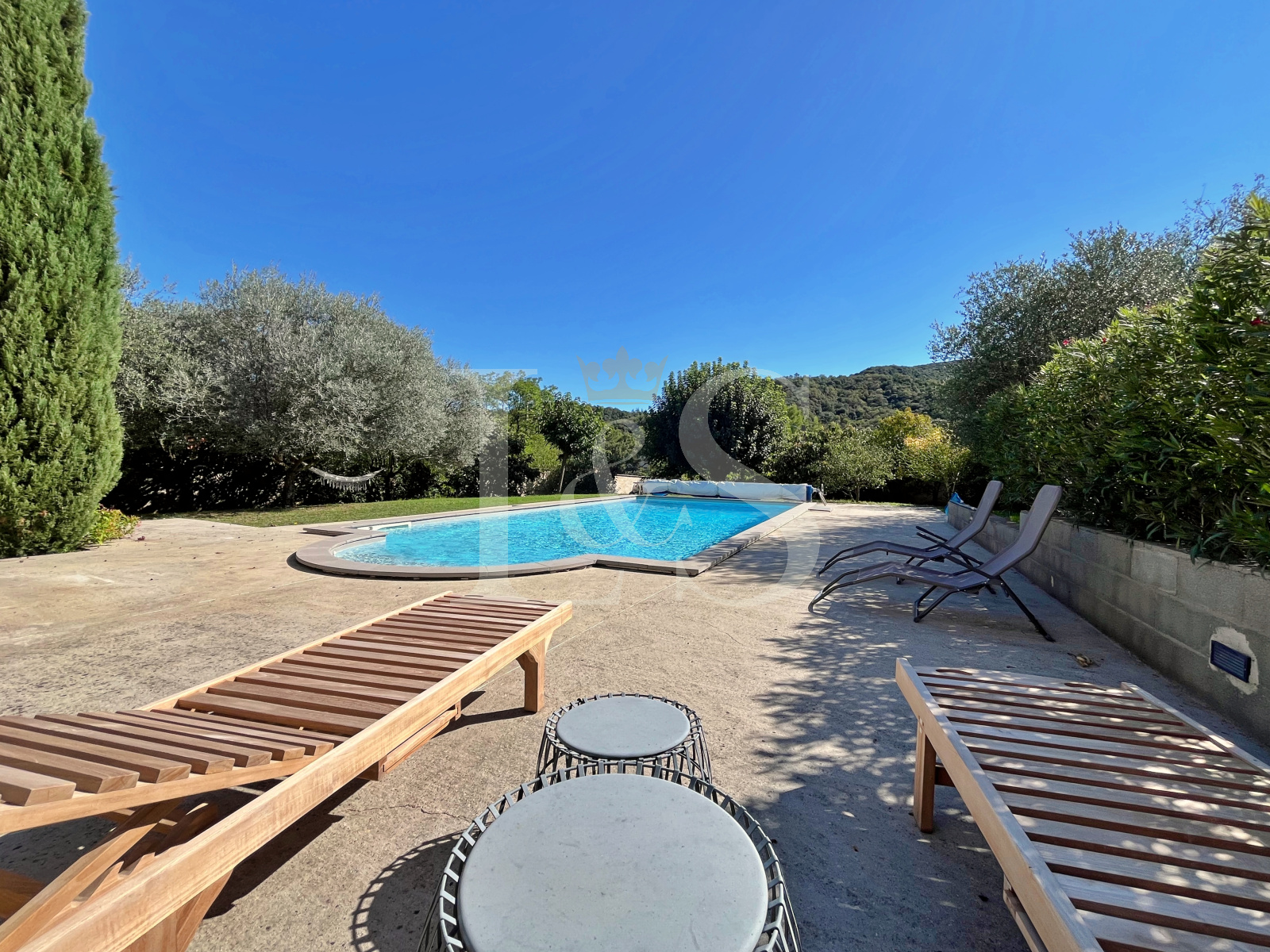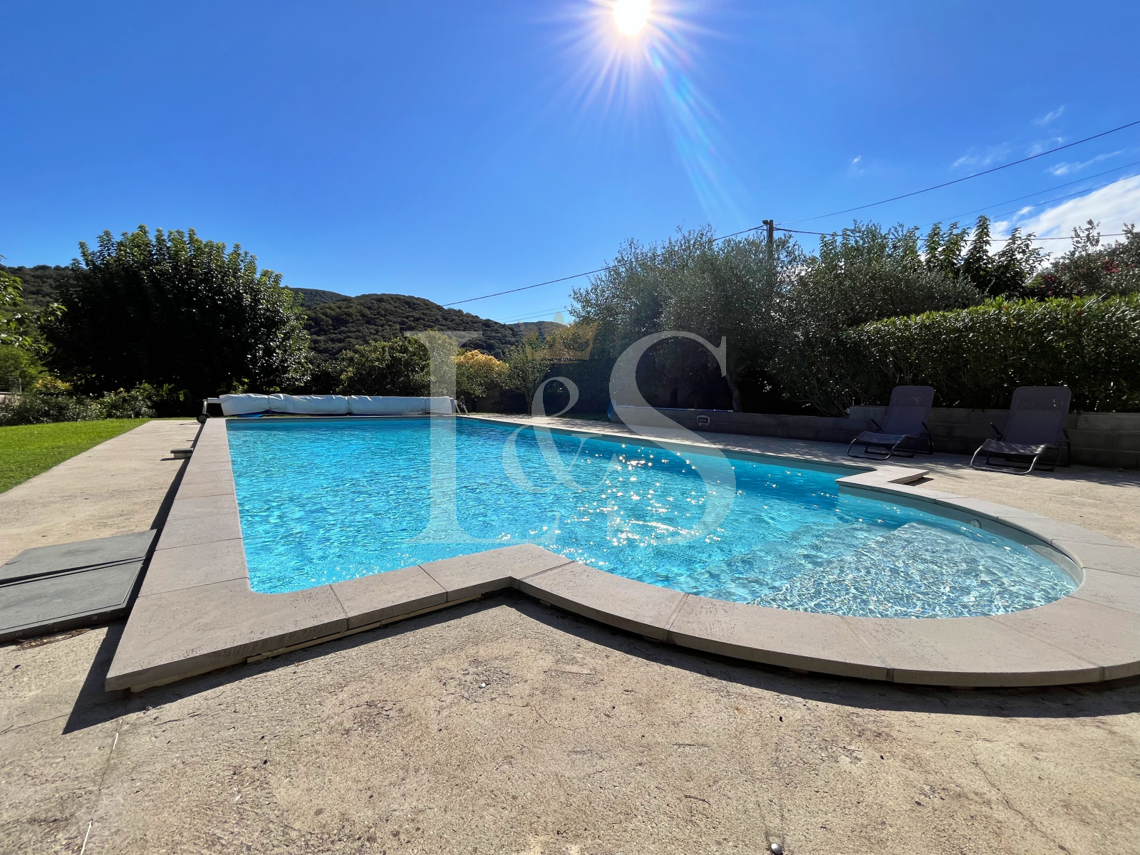 Le terrain, sans vis à vis, de 2 230 m², agrémenté d’arbres fruitiers et d’oliviers, accueille une piscine plein sud de 10 x 5 m.