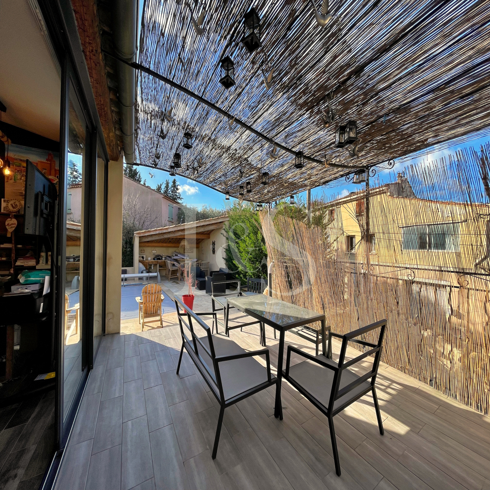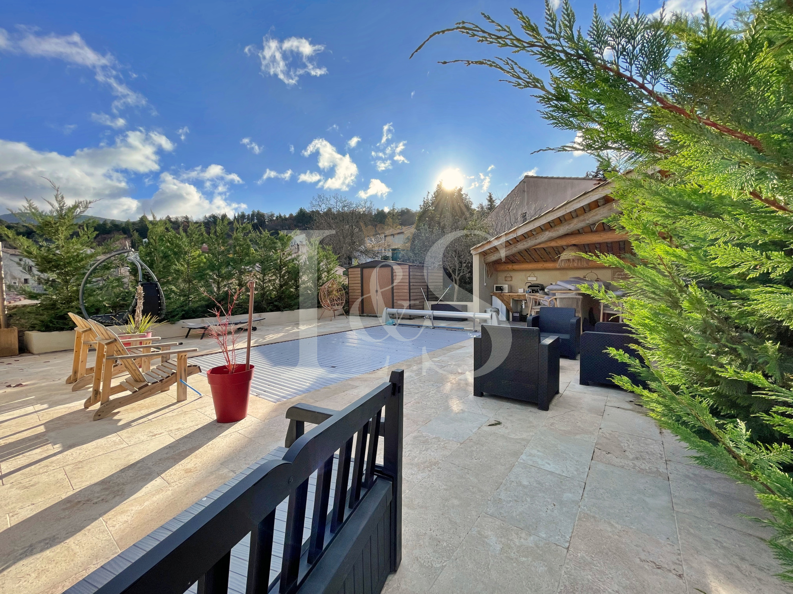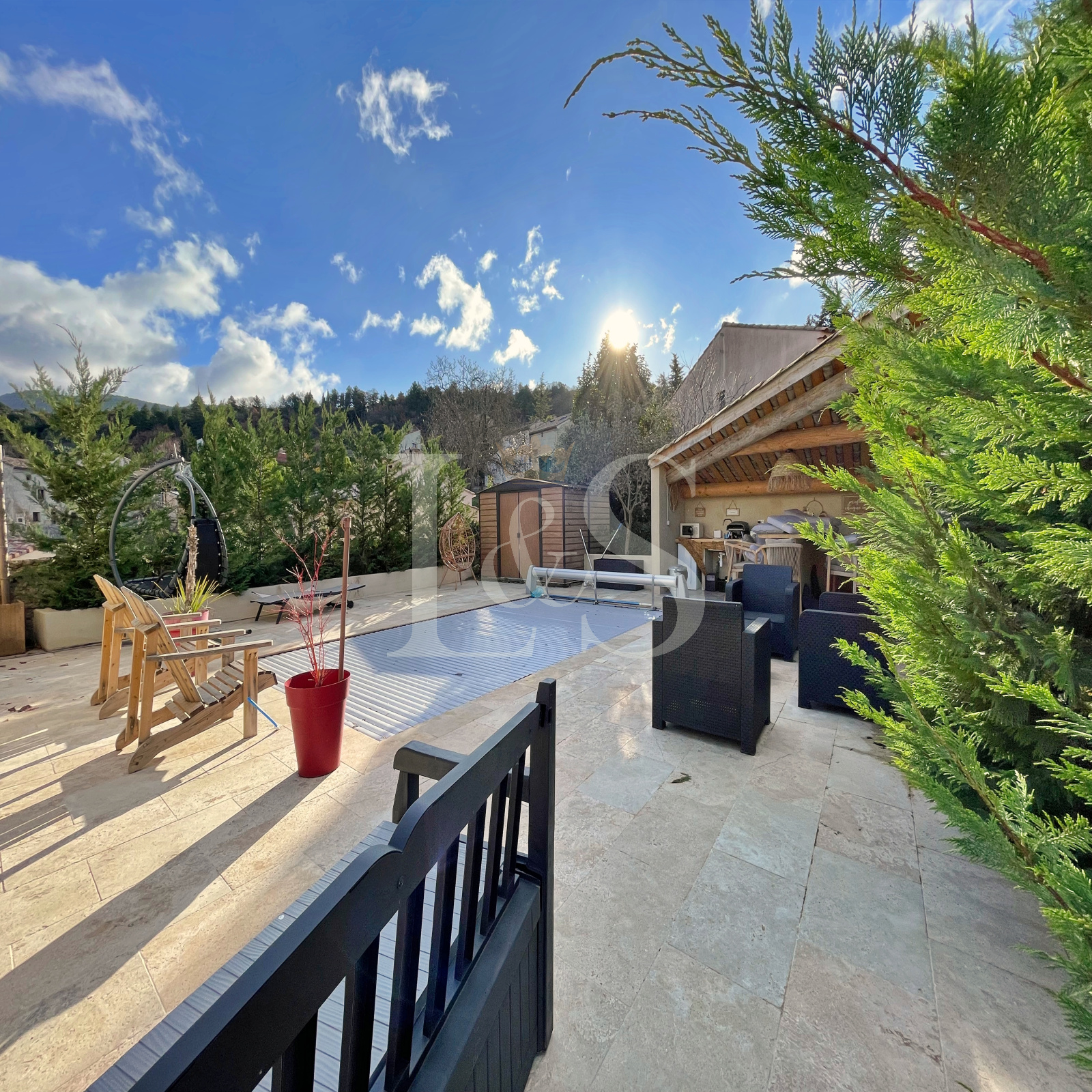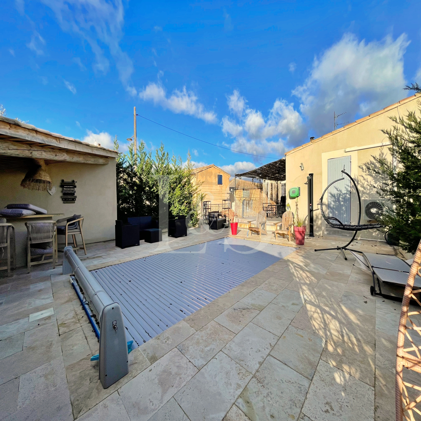 À l’extérieur, chacun pourra profiter d’une terrasse, d’une cour, d’une piscine sécurisée de 6x4m avec volet roulant, d’une cuisine d’été et d’un abri de jardin.