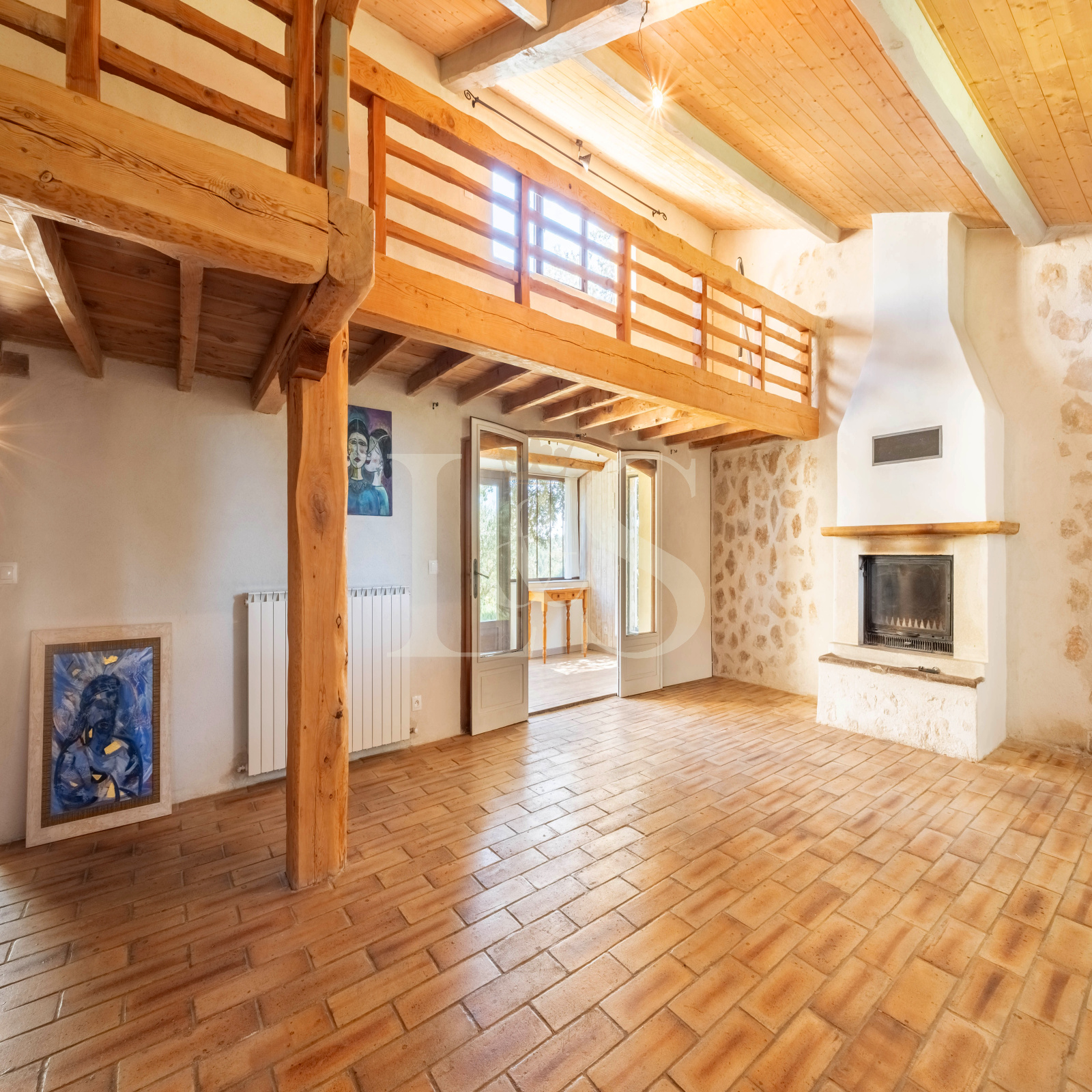 Le mas principal, d’une surface d’environ 130 m², a été restauré avec un soin particulier, alliant caractère ancien et confort moderne. Le rez-de-chaussée se compose d’une entrée menant à un spacieux salon-séjour de 40 m², avec cheminée insert et mezzanine ; un petit salon ou atelier de peinture climatisé ; une chambre de 14 m² ; une cuisine conviviale avec cellier et cave ; une salle de bains ; un wc indépendant.