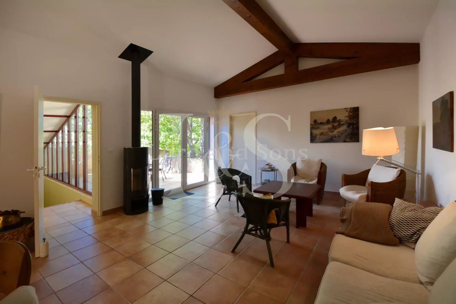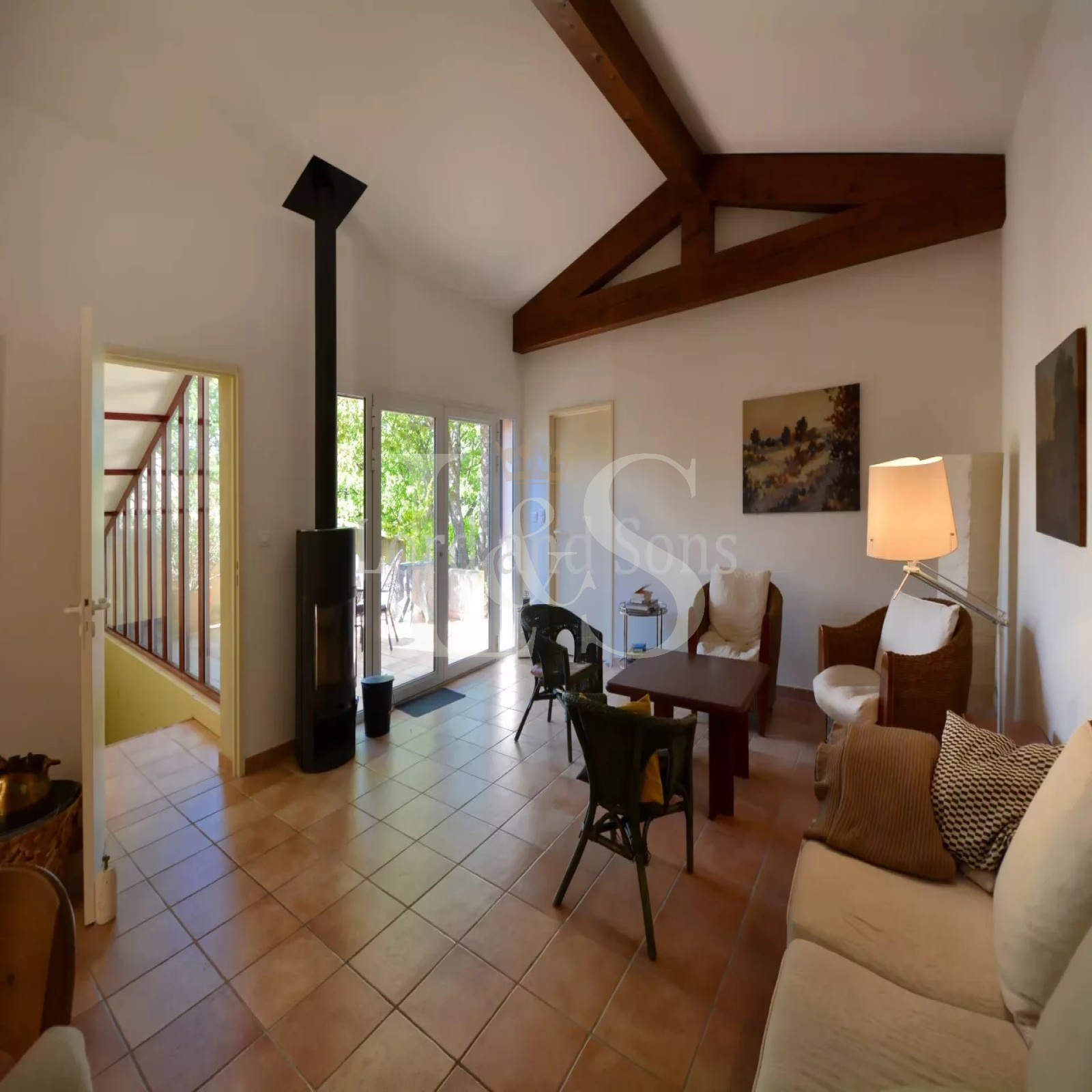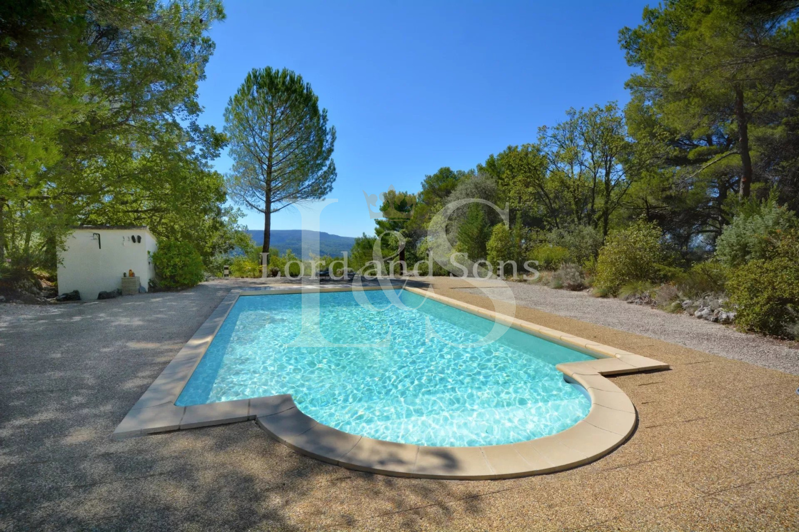 EXCLUSIVITE. Provence, Sud Ventoux, Monts de Vaucluse. Lord and Sons vous propose la vente de cette adorable villa de 160m² habitables (180m² de surface totale) située dans un environnement paradisiaque, au calme absolu et offrant des vues panoramiques sur les collines et la vallée. La bâtisse se compose comme suit: Au RDC: cuisine, salle à manger avec insert, salon avec cheminée, une chambre, salle de douche, wc et 2 terrasses. Un premier escalier mène à deux chambres et un second conduit à une construction plus récente composée d'un grand salon ouvrant sur une terrasse, une chambre avec cabinet de toilette, une seconde chambre avec terrasse, une salle de bains avec toilettes. Le terrain de 8300m², en restanque et très arboré, invite à la contemplation. Il accueille un atelier de peinture (ou chambre d'amis), un espace piscine avec son bassin de 10m x 5m et sa vue spectaculaire, ainsi qu'un garage. Une opportunité rare!