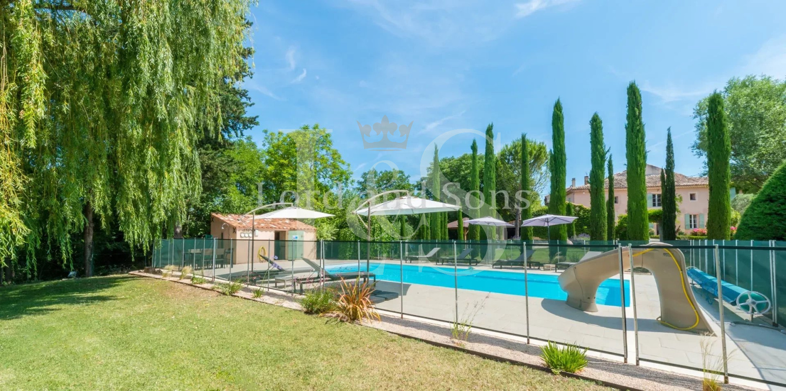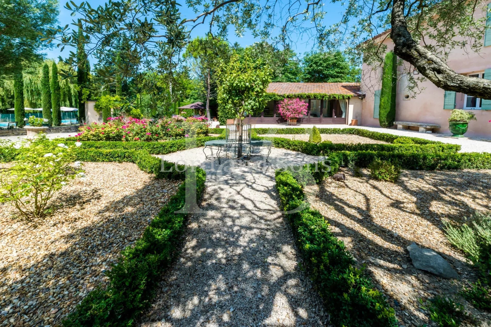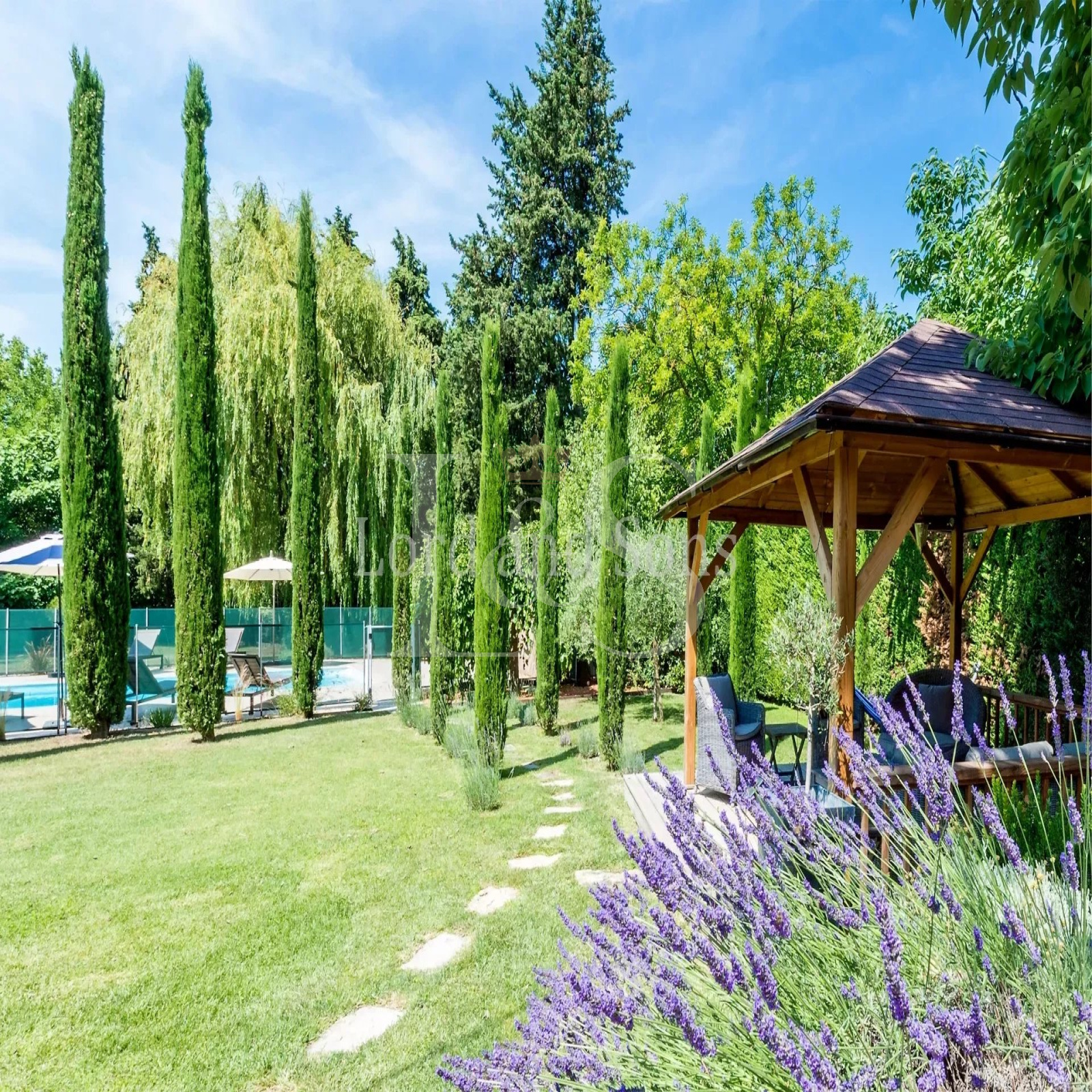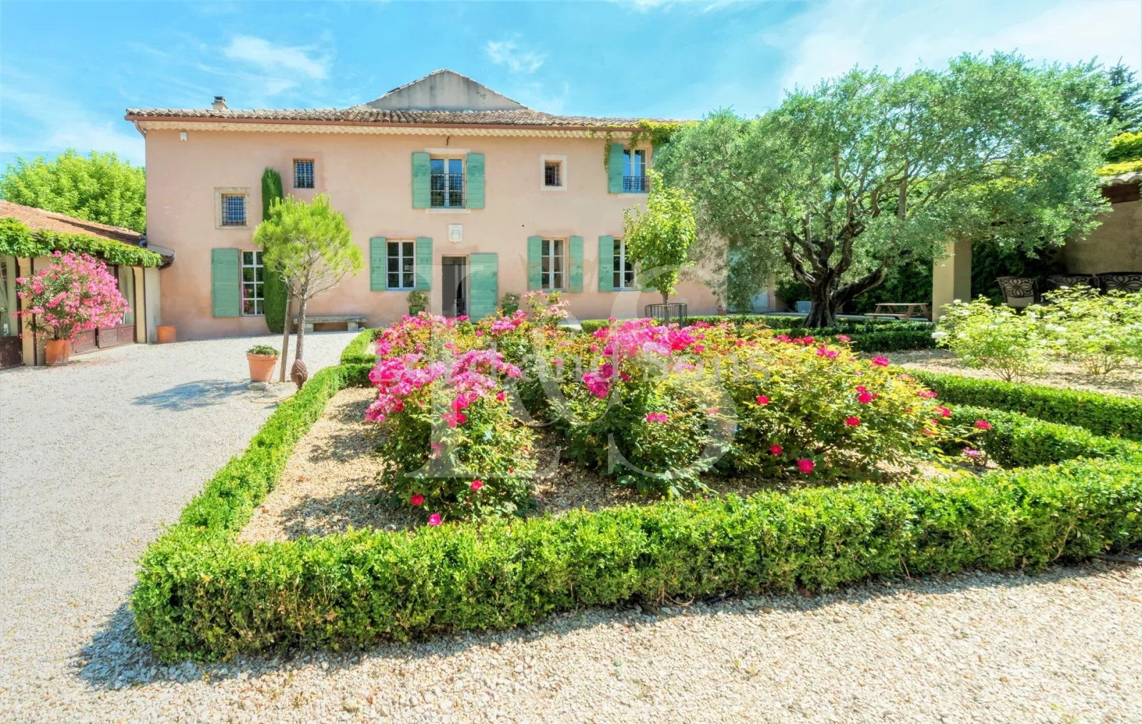 Exclusivité. Provence, Vaucluse, sud Ventoux, en campagne de Carpentras. Lord and Sons vous propose la vente de cette superbe propriété, partie d'un ancien couvent datant du 9ème siècle, un véritable oasis de calme et de verdure situé dans les faubourgs de la capitale du Comtat Venaissin. Elle a été entièrement rénovée et offre des prestations remarquables. La maison principale se compose comme suit: - au RDC: hall d'entrée, salle à manger avec cheminée, cuisine toute équipée avec accès direct à une terrasse couverte, salon, salle de bains avec wc. - A l'étage, le palier dessert une chambre parentale, un salon, une salle de bains avec toilettes et deux autres chambres partageant une salle de douche avec toilettes. La maison d'amis (ou gite) comprend: un séjour avec une cuisine entièrement équipée, 2 chambres, une salle de bains, un wc séparé, une buanderie et une cave à vin. A l'extérieur, le magnifique jardin paysager et le parc arboré sont agrémentés d'une piscine 12mx5m chauffée (filtration au sel), d'un adorable gazebo, de 2 terrasses couvertes, d'un boulodrome et d'un garage. Une très belle propriété, au calme absolu, située à 5 min des commerces et des voies rapides menant à l'autoroute A7, Avignon TGV ou vers le mythique Mont Ventoux.