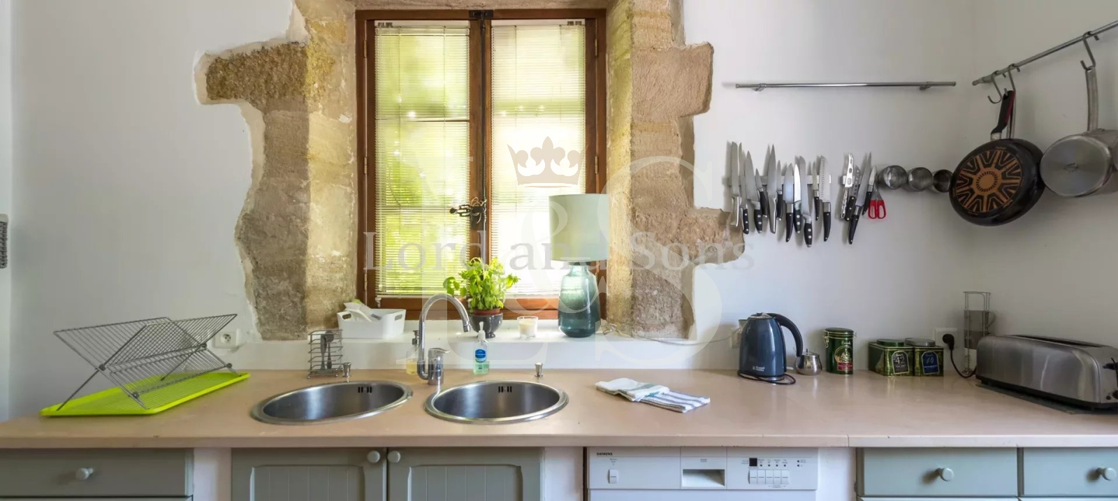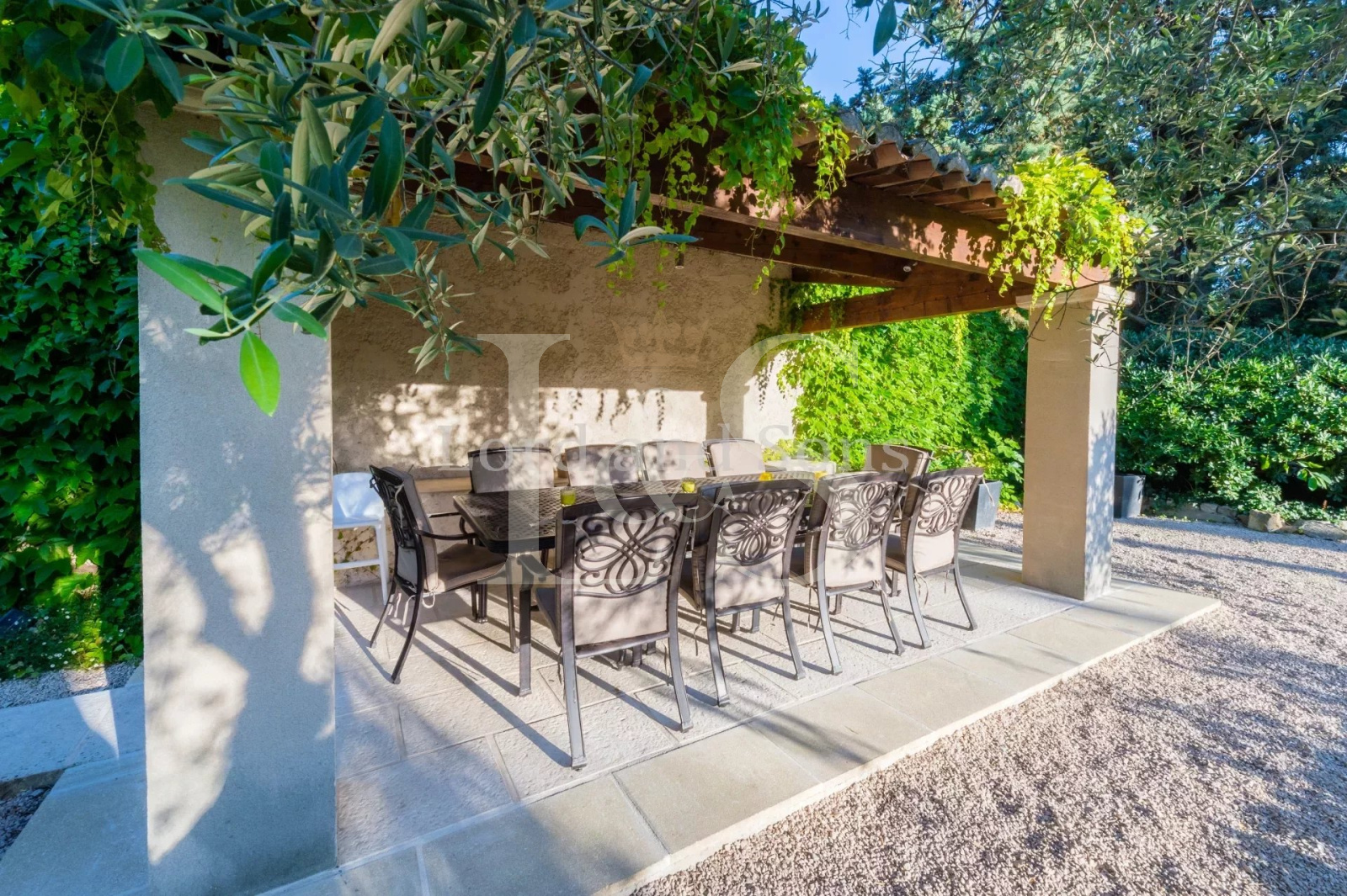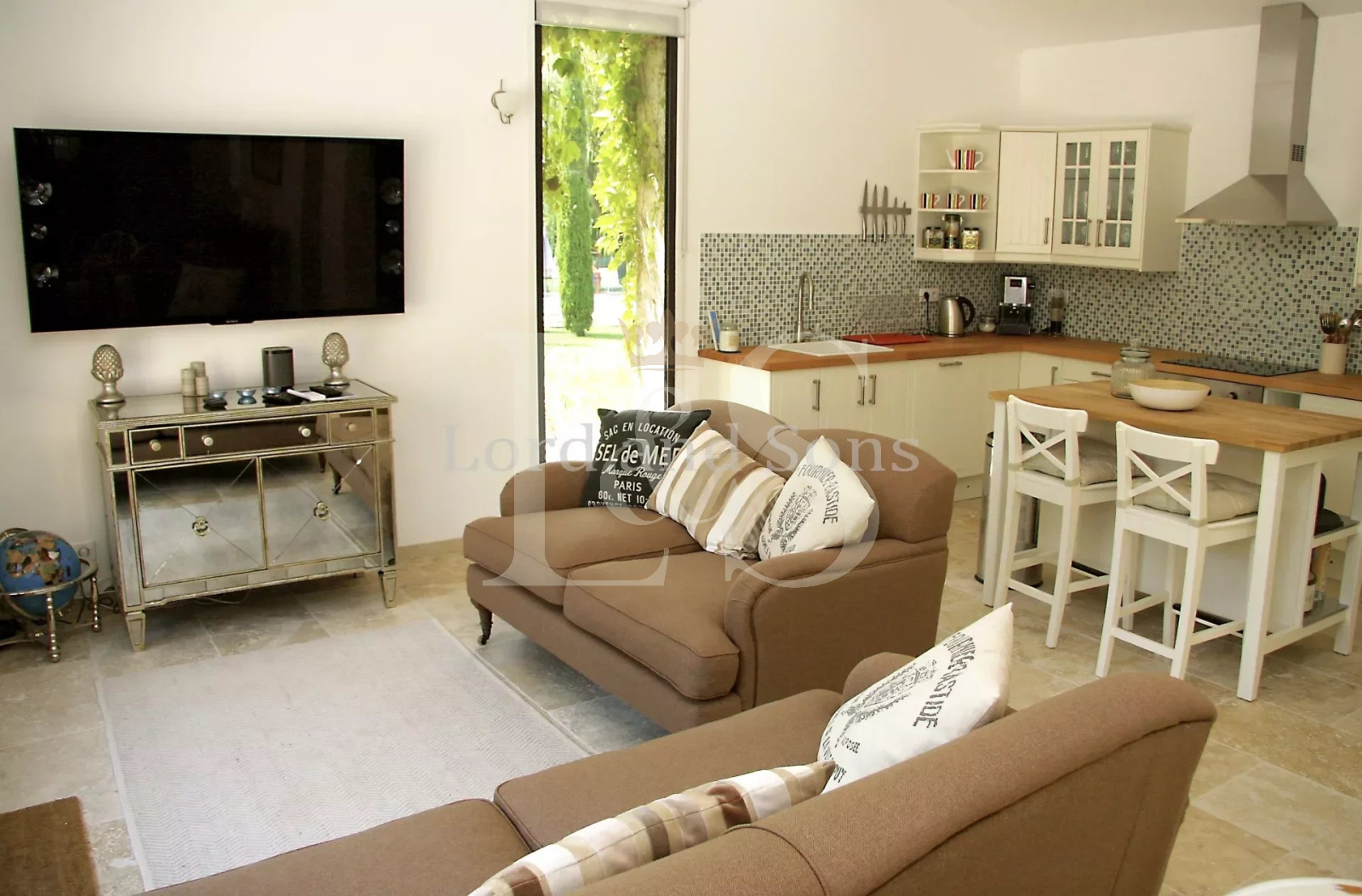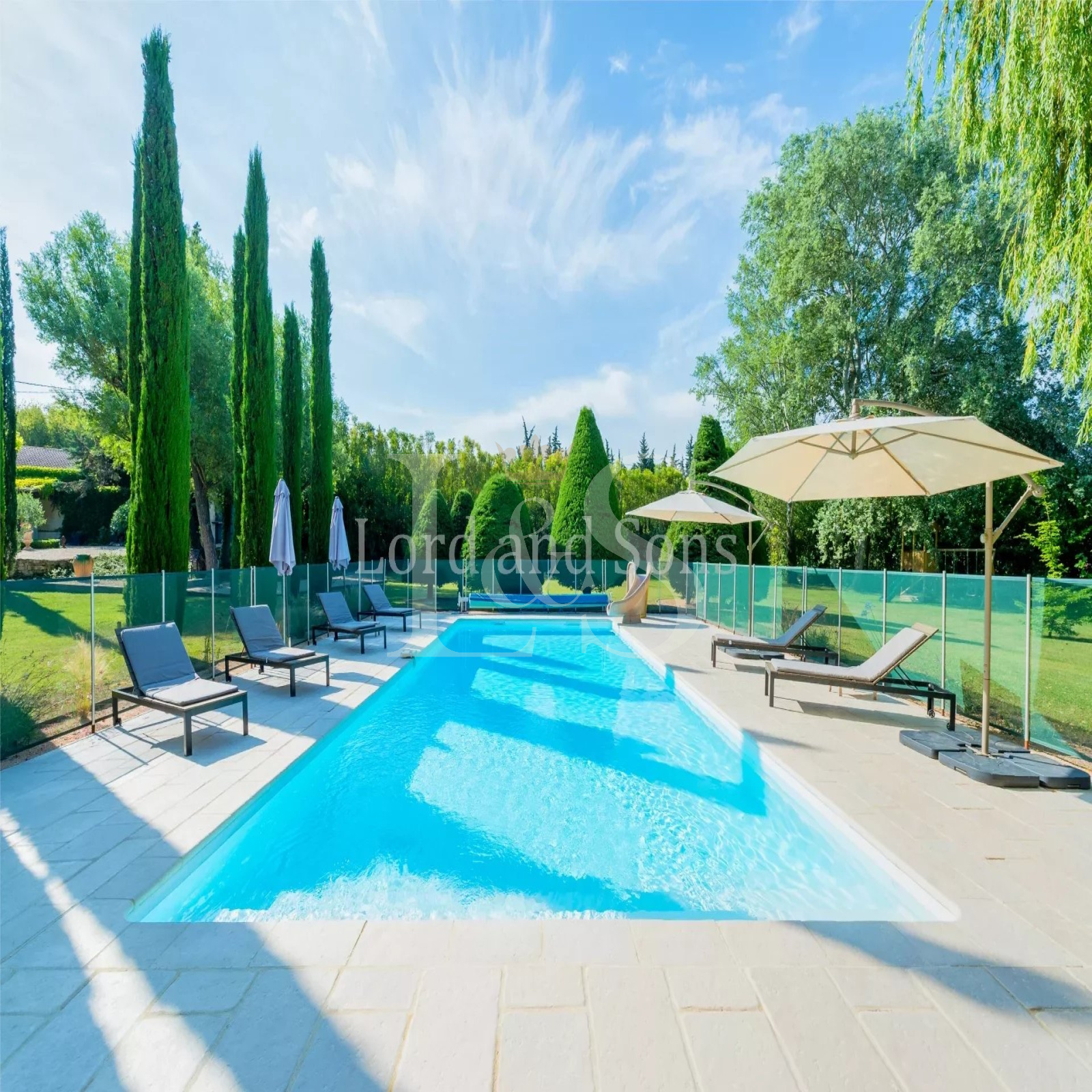 Exclusivité. Provence, Vaucluse, sud Ventoux, en campagne de Carpentras. Lord and Sons vous propose la vente de cette superbe propriété, partie d'un ancien couvent datant du 9ème siècle, un véritable oasis de calme et de verdure situé dans les faubourgs de la capitale du Comtat Venaissin. Elle a été entièrement rénovée et offre des prestations remarquables. La maison principale se compose comme suit: - au RDC: hall d'entrée, salle à manger avec cheminée, cuisine toute équipée avec accès direct à une terrasse couverte, salon, salle de bains avec wc. - A l'étage, le palier dessert une chambre parentale, un salon, une salle de bains avec toilettes et deux autres chambres partageant une salle de douche avec toilettes. La maison d'amis (ou gite) comprend: un séjour avec une cuisine entièrement équipée, 2 chambres, une salle de bains, un wc séparé, une buanderie et une cave à vin. A l'extérieur, le magnifique jardin paysager et le parc arboré sont agrémentés d'une piscine 12mx5m chauffée (filtration au sel), d'un adorable gazebo, de 2 terrasses couvertes, d'un boulodrome et d'un garage. Une très belle propriété, au calme absolu, située à 5 min des commerces et des voies rapides menant à l'autoroute A7, Avignon TGV ou vers le mythique Mont Ventoux.