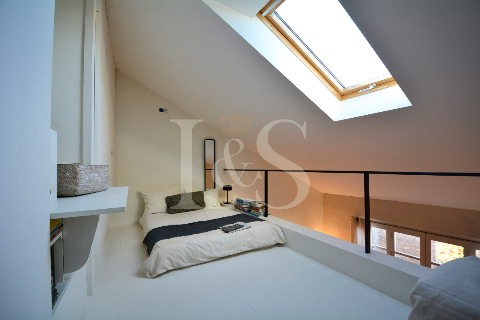 Le dernier niveau se compose d’une chambre avec de très nombreux placards et d’une mezzanine servant de chambre d’appoint ou bureau.
