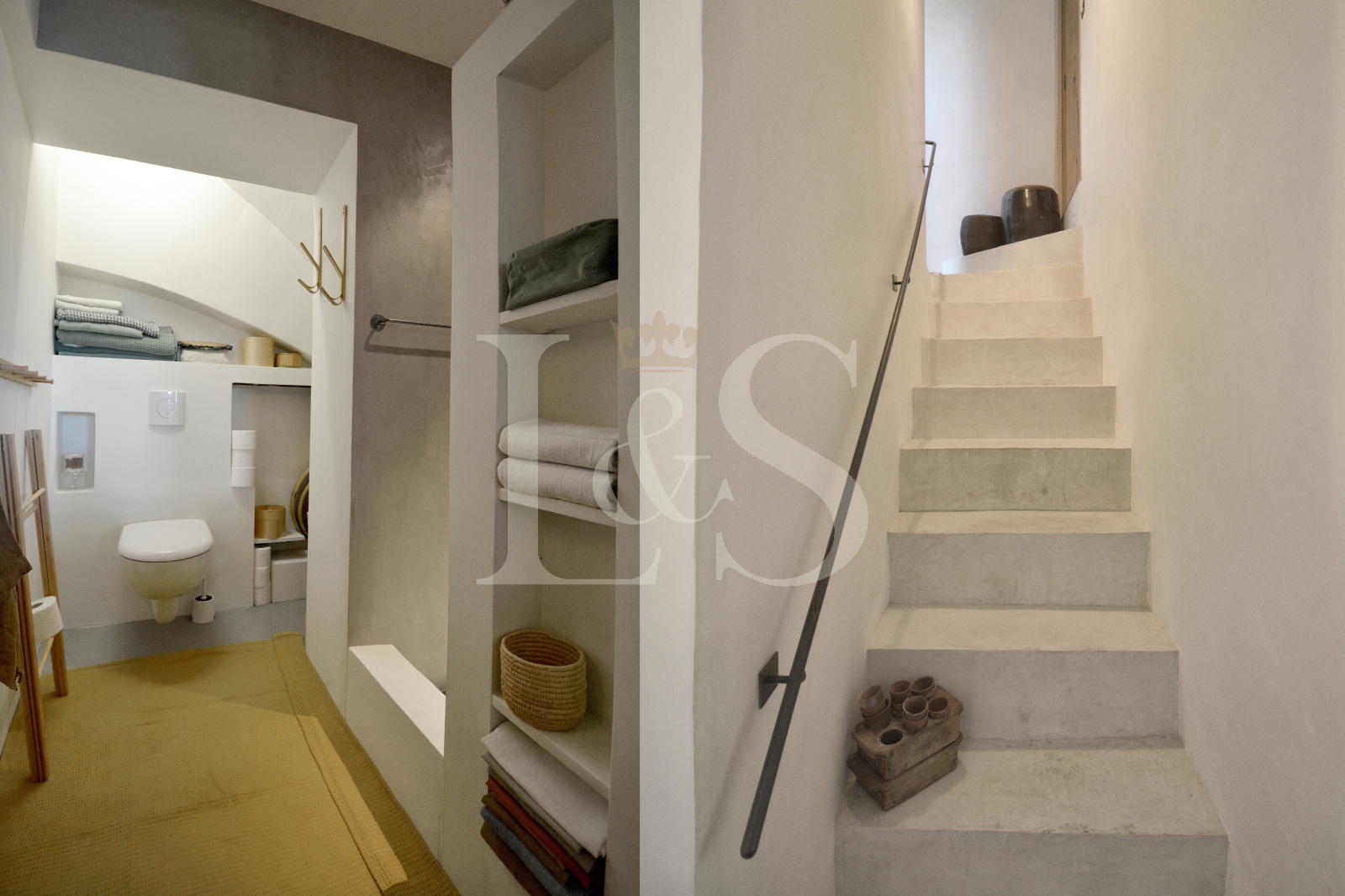 Au rdc, une première pièce, pavée d’une magnifique calade et agrémentée de profonds placards, peut être aménagée en petite boutique, cuisine, salon…selon vos envies. Dans le prolongement une vaste chambre et sa salle de douche avec wc.