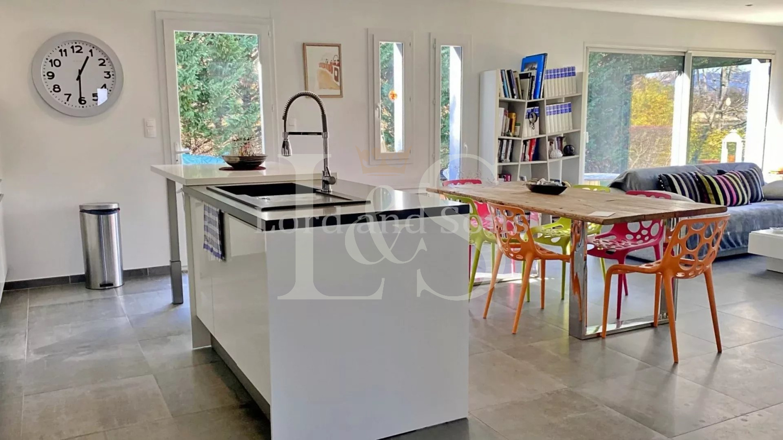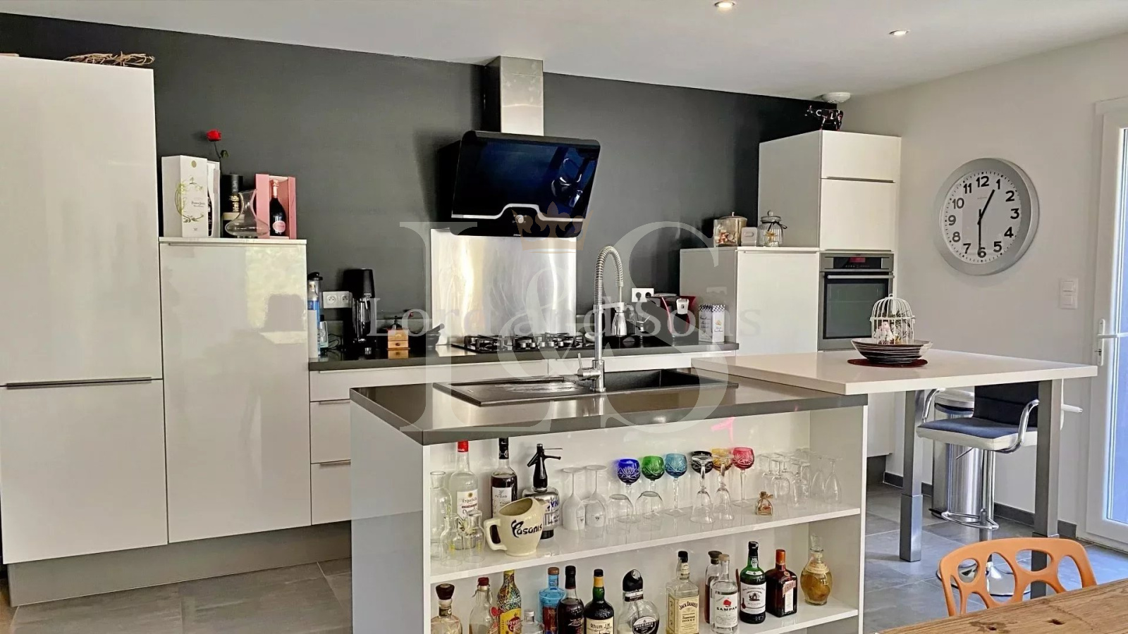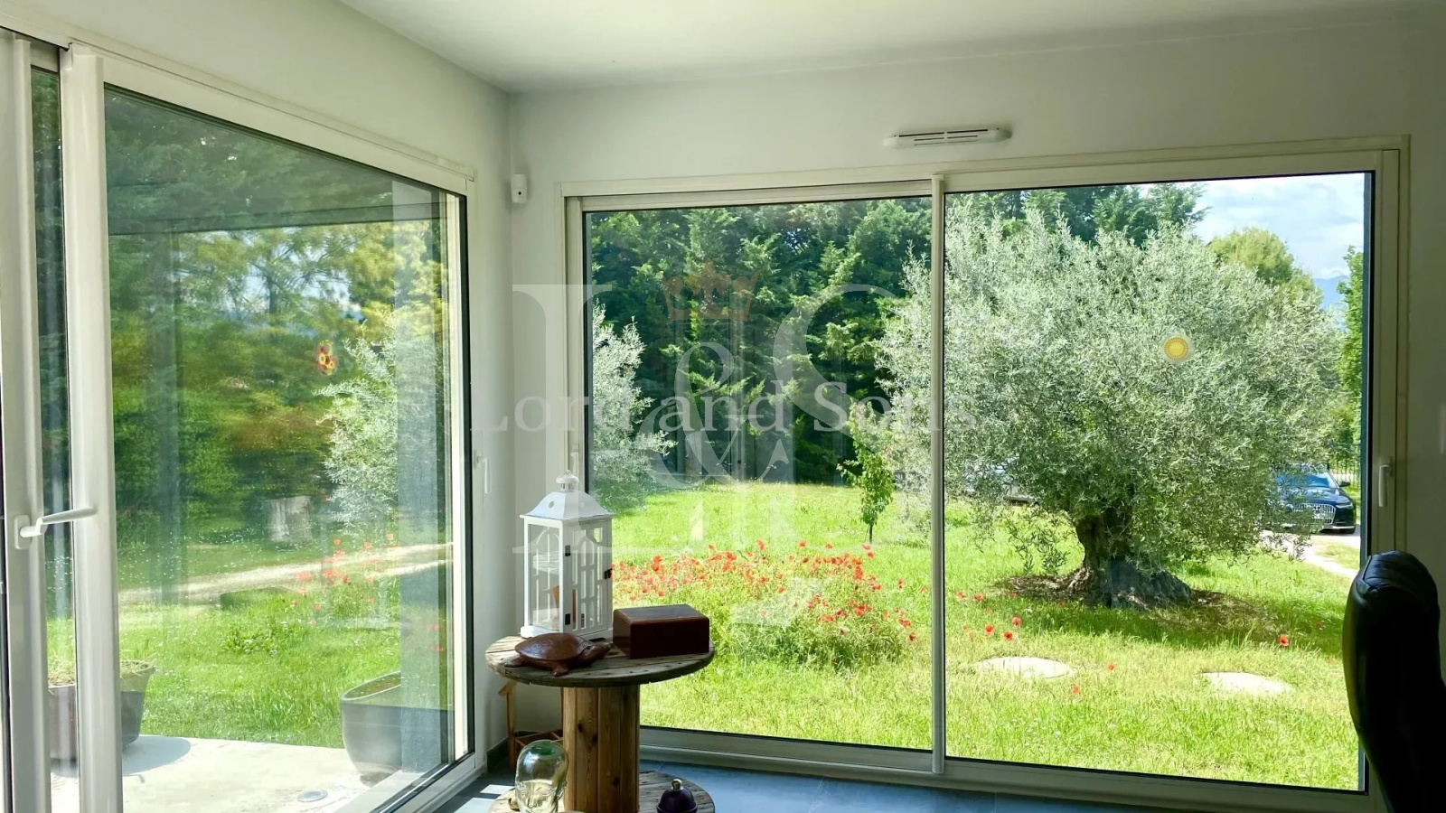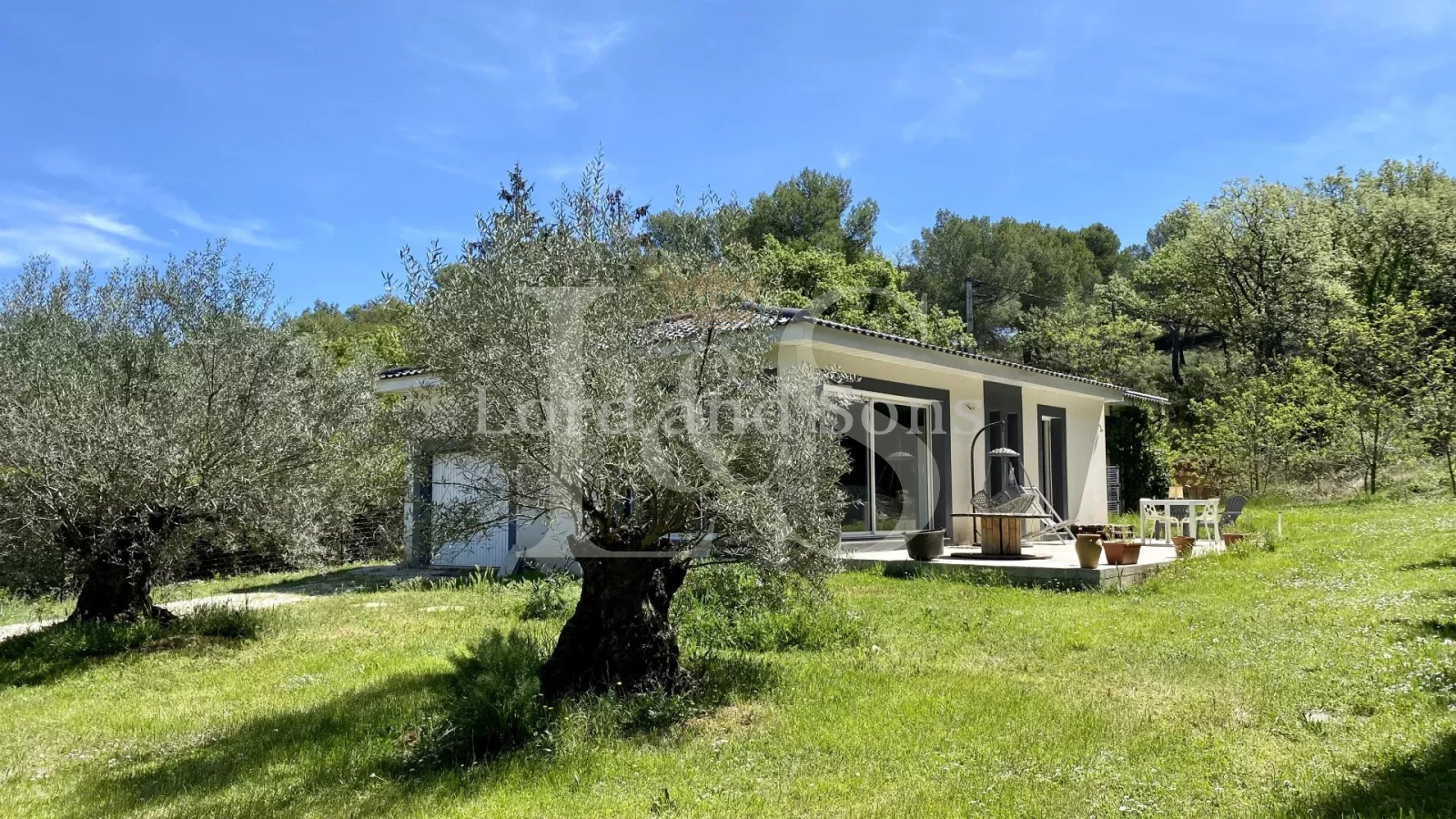 Vaucluse. Luberon. A 35 mn d'Aix en Provence et sa Gare TGV. L'agence immobilière Lord and Sons vous propose à la vente en exclusivité cette villa construite en 2015 avec possibilité d'agrandissement. Les pièces à vivre sont spacieuses et extrêmement lumineuses. La cuisine est ouverte sur le salon, elle est entièrement aménagée et équipée de matériel de qualité. La villa dispose de 3 chambres dont une suite avec salle d'eau et dressing, une deuxième salle d'eau est à terminer, un garage, un cellier et une cave à vin indépendante. Terrain de 2527 m² entièrement clos et arboré. Cette villa est située à l'orée du village de Grambois en campagne, non isolée. Au calme. Construction d'une piscine possible.