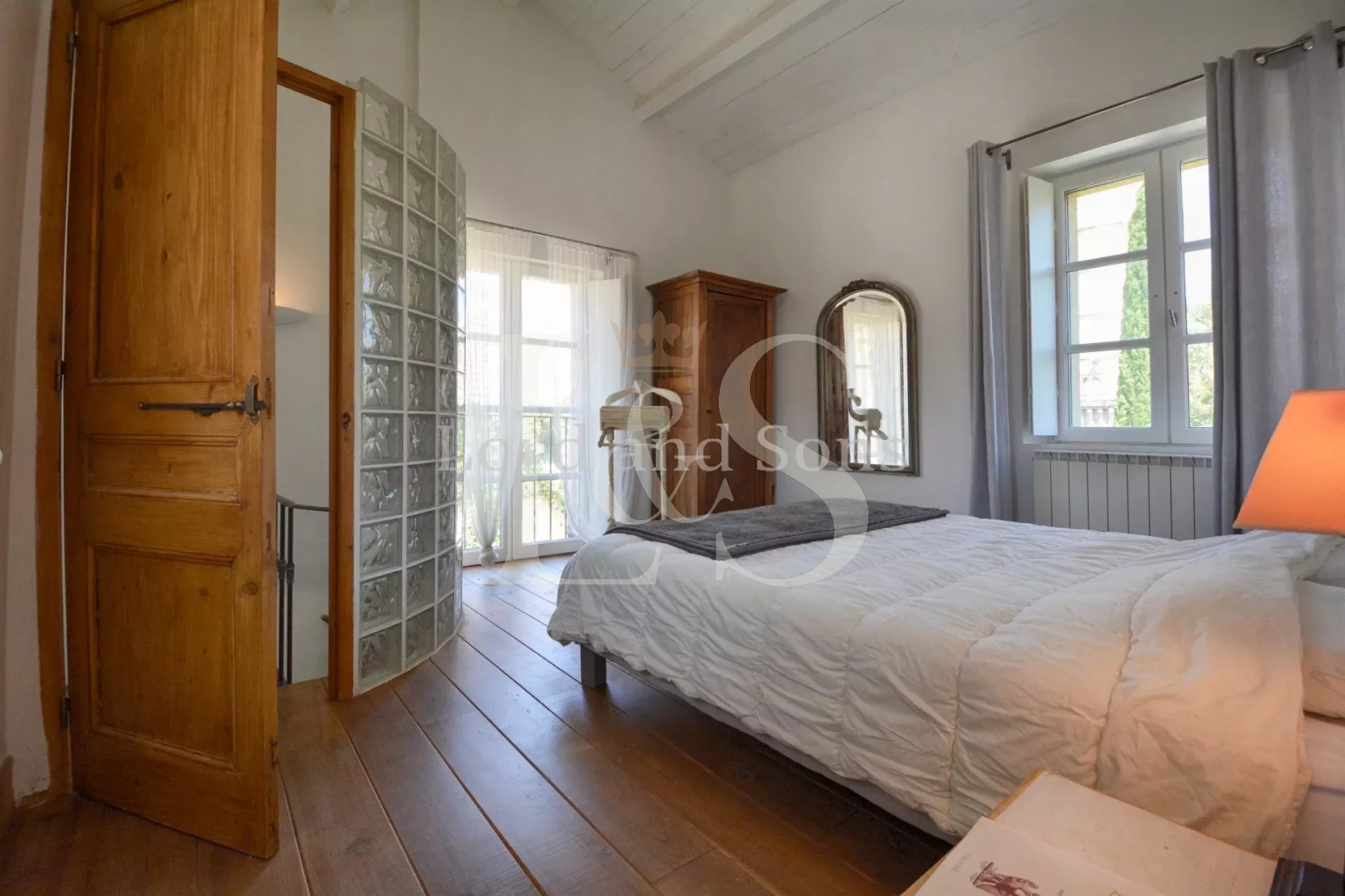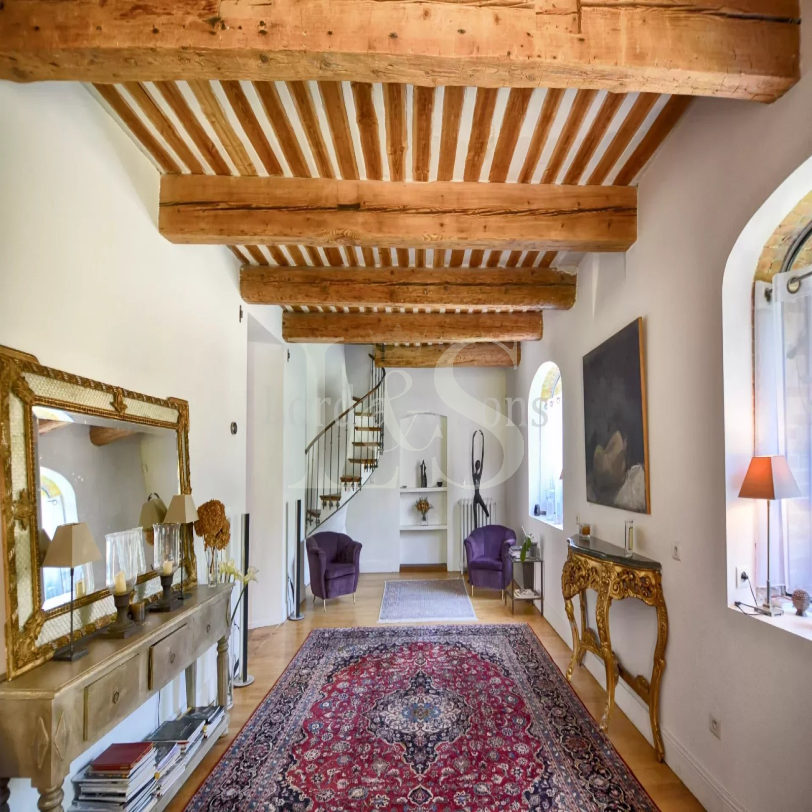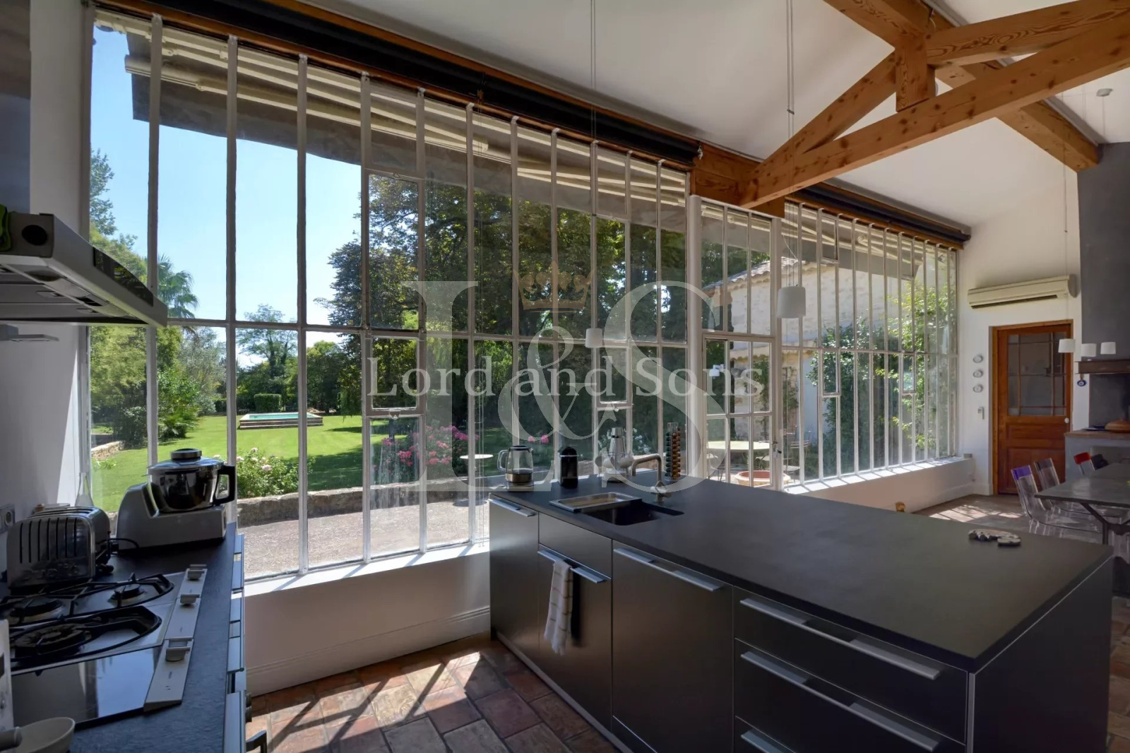 Provence, Vaucluse, pays des Sorgues, entre Avignon et l'Isle sur la Sorgue. Nichée dans un hameau plein de charme, exclusif et préservé de toute nuisance, cette propriété du 19ème siècle a été entièrement rénovée et transformée en une demeure de prestige. La grande verrière d'époque s'ouvre sur la cuisine-salle à manger de 33m², un premier salon de 36m², un second salon de 50m², une grande chambre, une salle de bains et une cour intérieure. À l'étage, on trouve 2 chambres, dont une avec terrasse, une salle de douche avec WC. À l'arrière de la bâtisse, une annexe propose une grande chambre (ou bureau), une salle de sport avec salle de douche et WC.