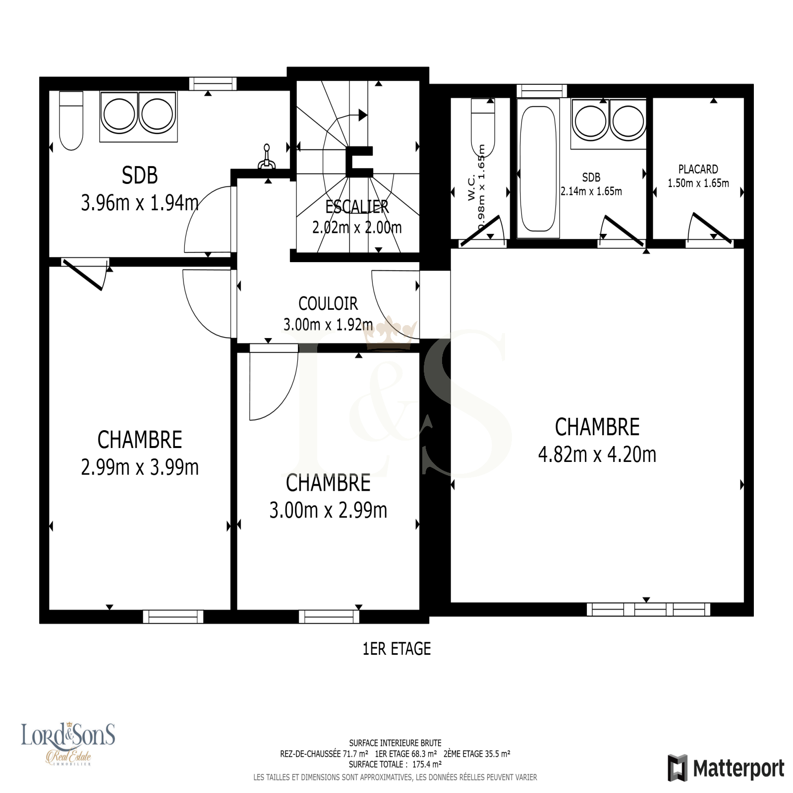 À l’étage, une suite parentale avec dressing et salle de bain privative, deux autres chambres partageant une salle de douche et wc.