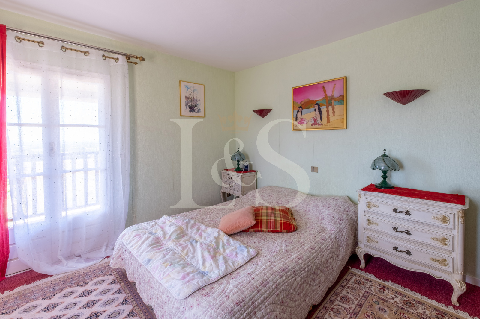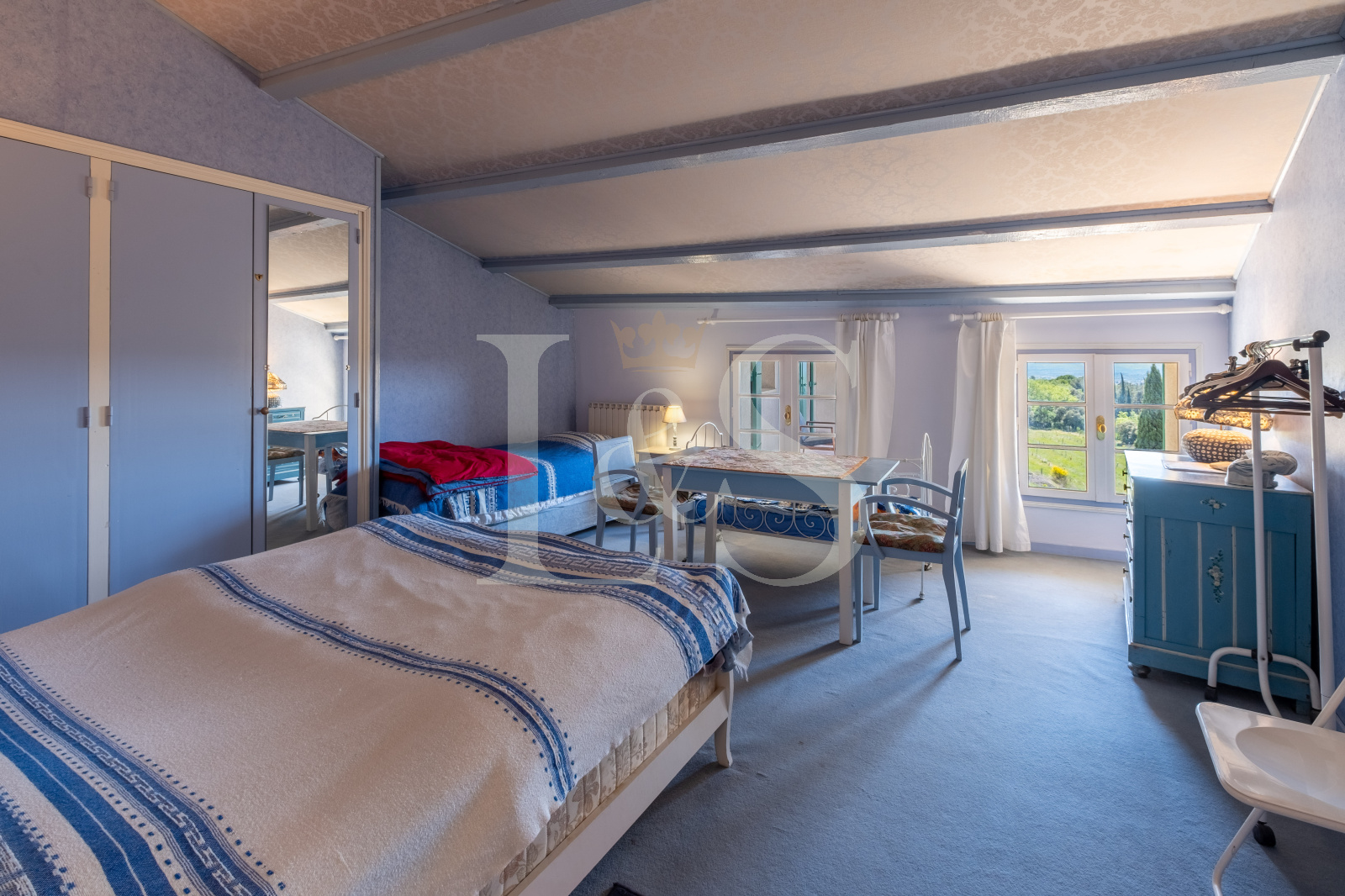 - La partie principale offre une grande cuisine provençale (28 m²), un double séjour lumineux (57 m²), huit chambres, une salle de bain, quatre salles de douche, un vaste bureau et une buanderie.