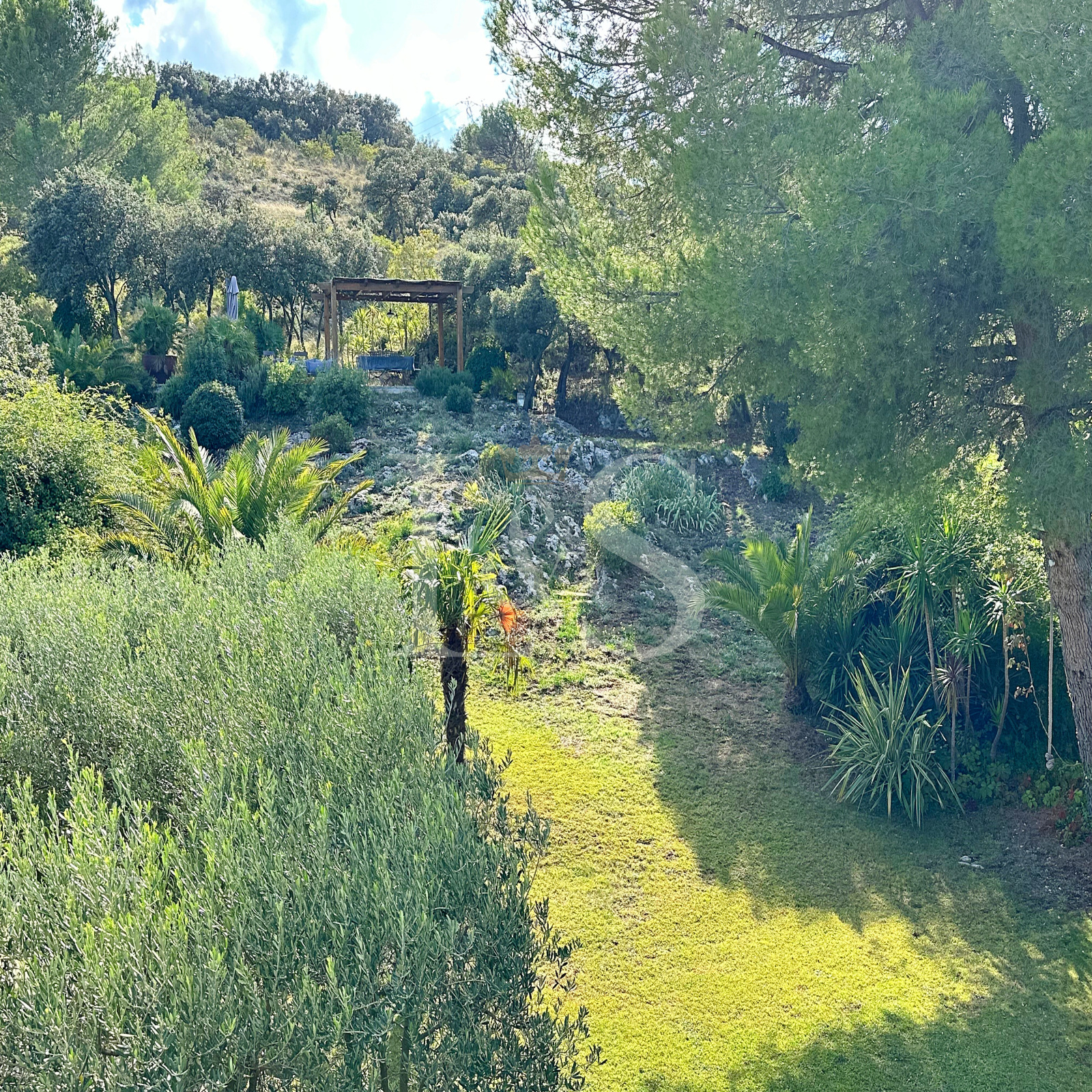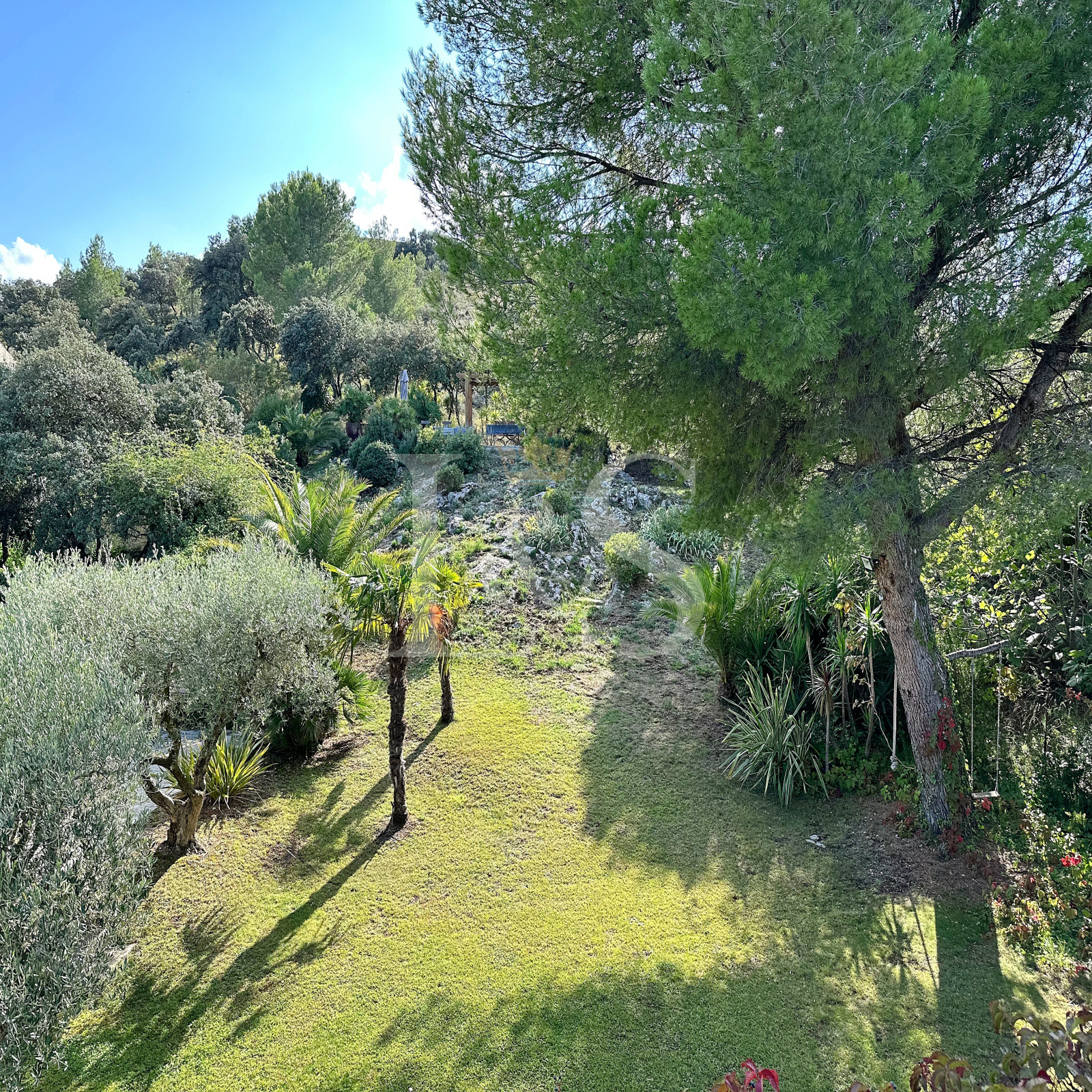 Jardin méditerranéen : un véritable havre de paix, magnifiquement paysagé avec des palmiers, une quinzaine d’oliviers, et un majestueux pin, créant un cadre apaisant et luxuriant.