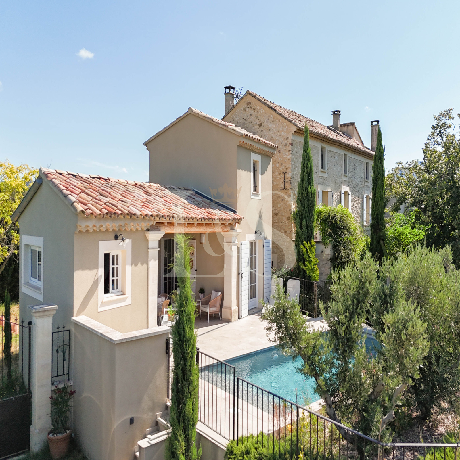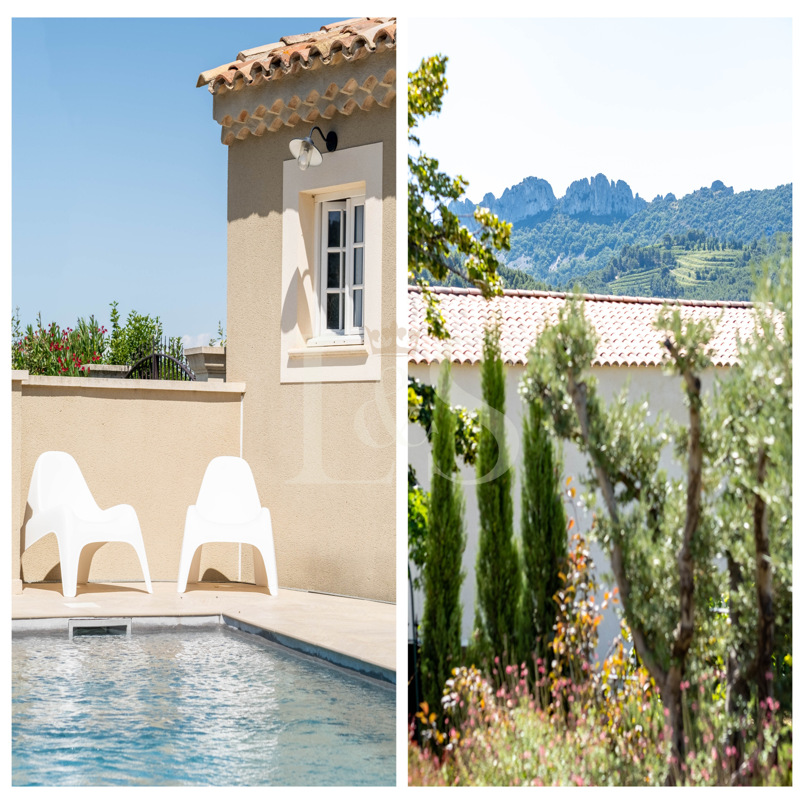 À l’extérieur, vous profiterez d’un grand jardin paysager, d’une superbe piscine avec vue dégagée sur les Dentelles de Montmirail, ainsi que de plusieurs terrasses ombragées, parfaites pour les repas d’été.