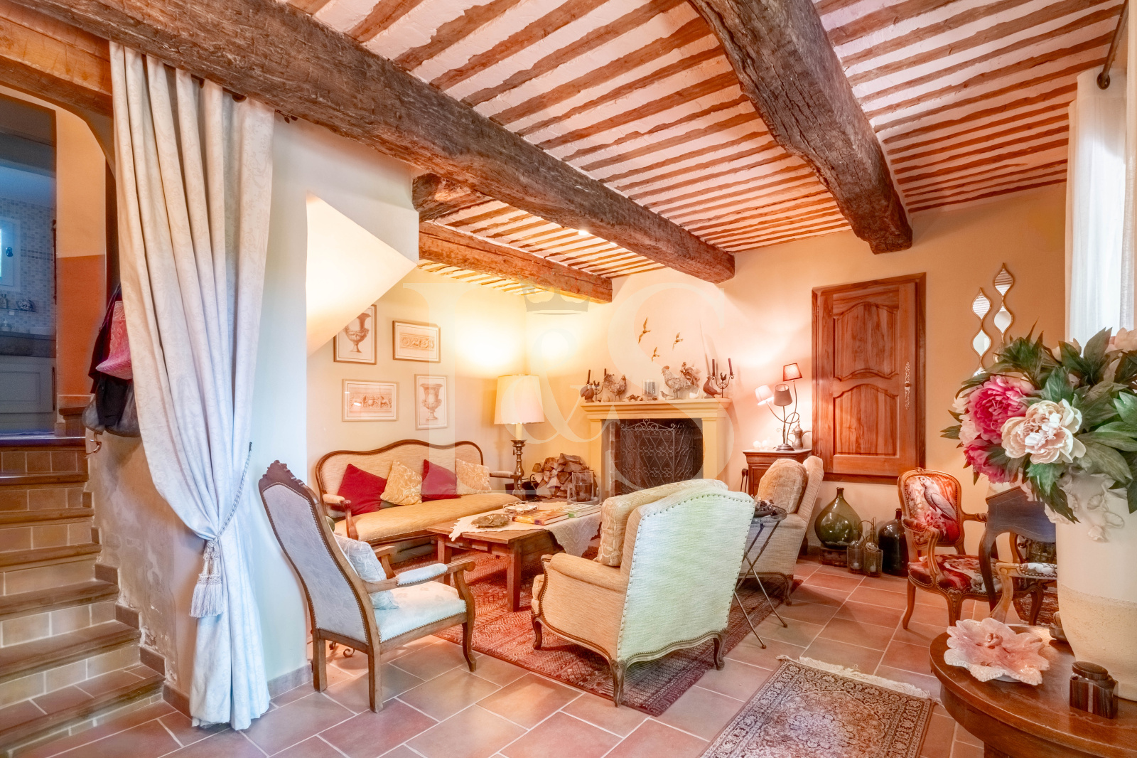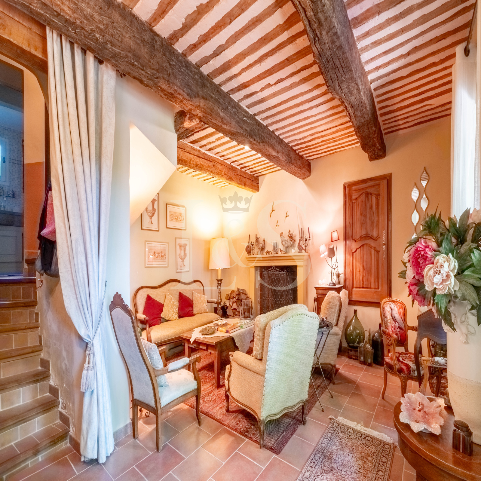 - Un salon chaleureux avec poutres apparentes et plafond à la provençale