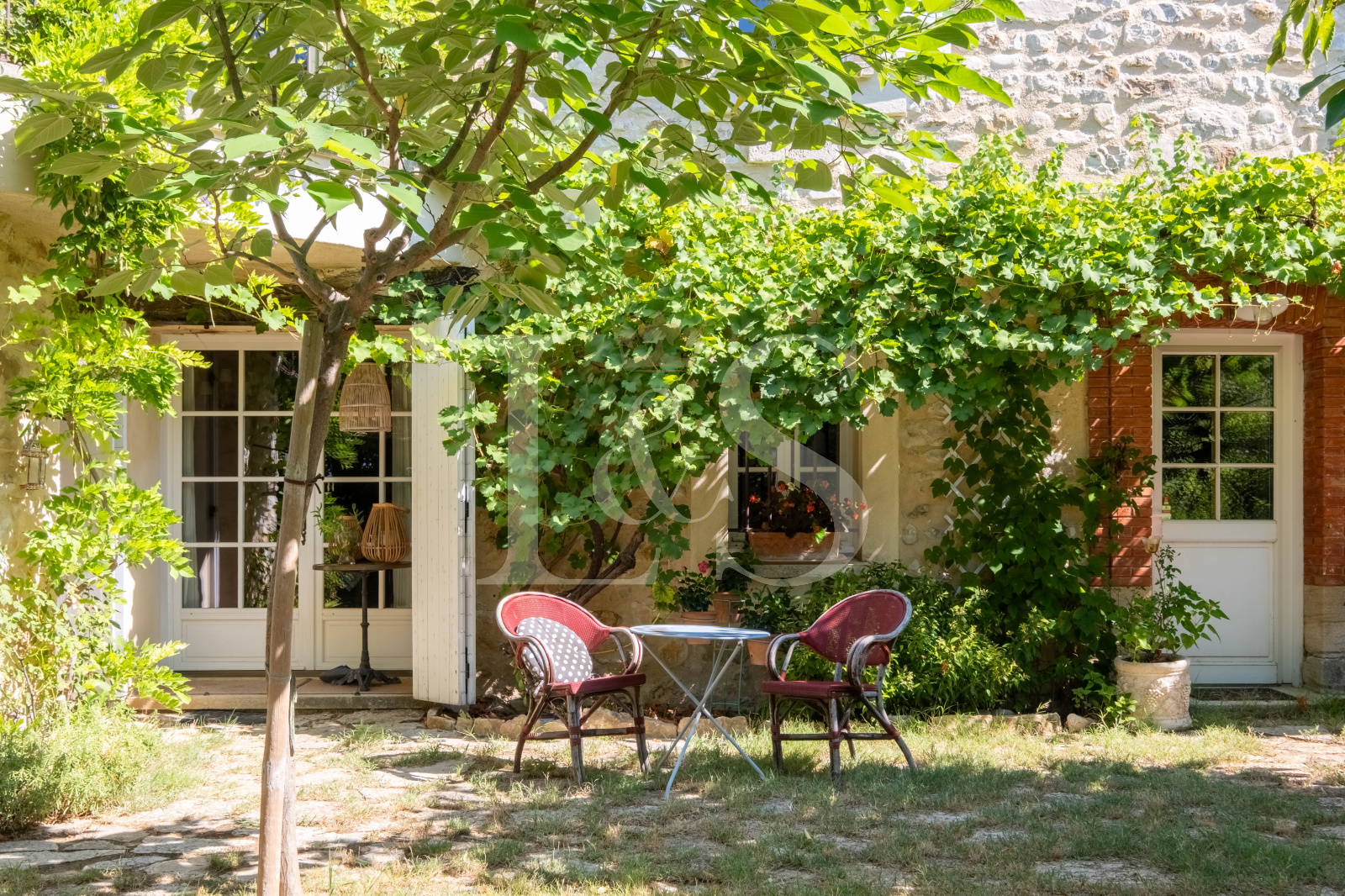 Une annexe indépendante de 40 m², pouvant être reliée au mas, comprend un salon, une cuisine équipée, une salle d’eau avec toilettes, ainsi qu’une chambre en mezzanine.