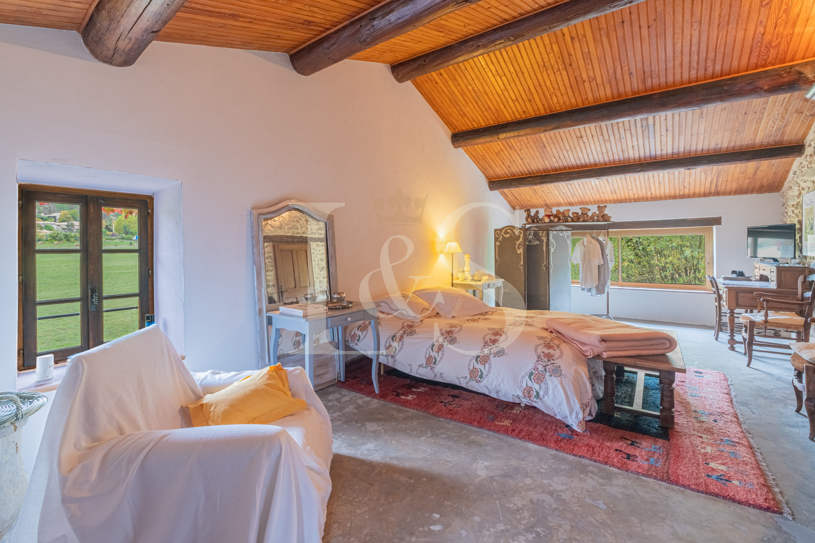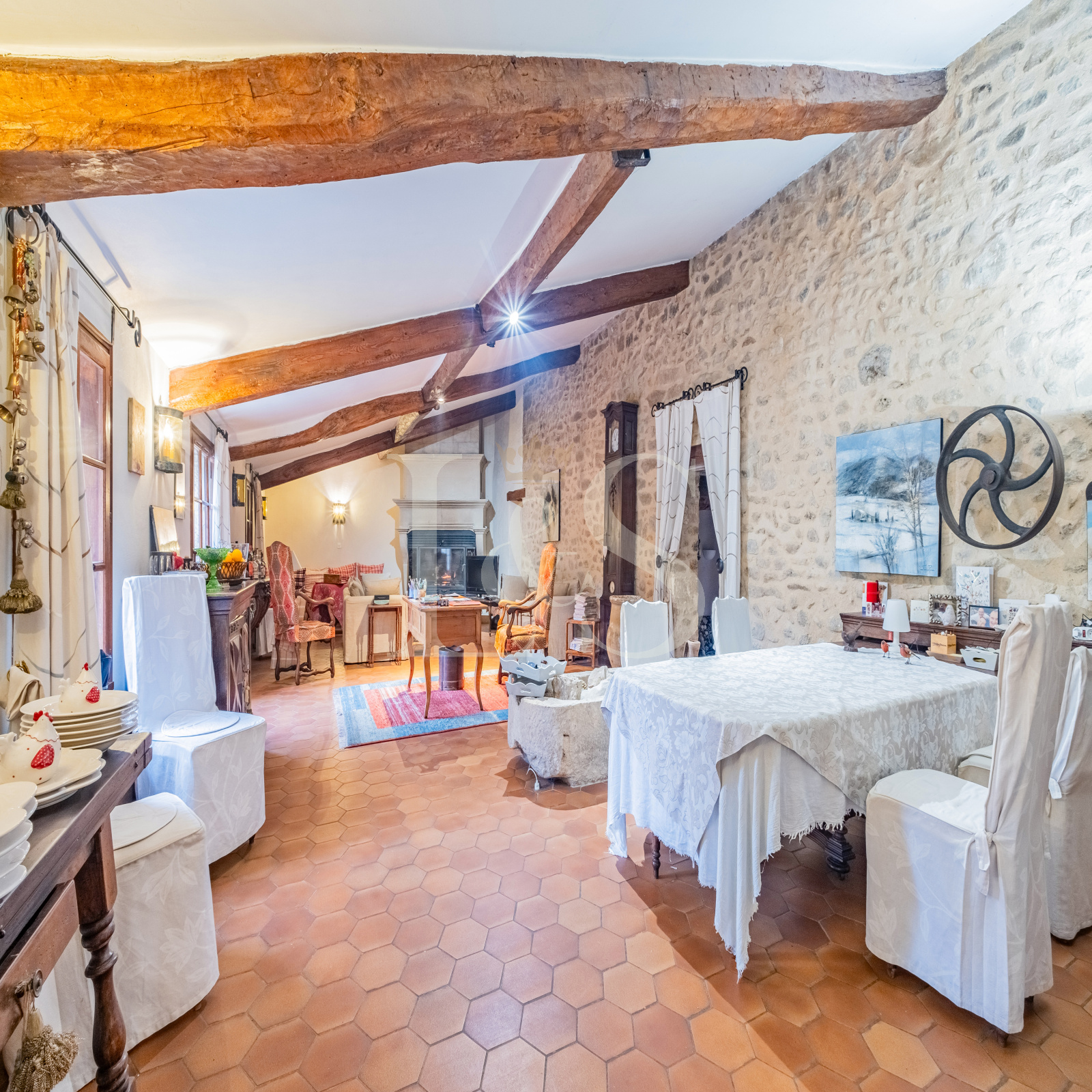 L’intérieur spacieux et lumineux comprend un séjour de 75 m², parfait pour des moments de convivialité en famille ou entre amis. La cuisine équipée allie charme et fonctionnalité, tandis qu’une véranda de 22 m² permet de profiter de la vue en toutes saisons. La maison dispose de 4 chambres, dont une agrémentée d’une cheminée tubée, d’un bureau, de deux salles de bain avec WC, ainsi que de plusieurs espaces supplémentaires aux usages variés.