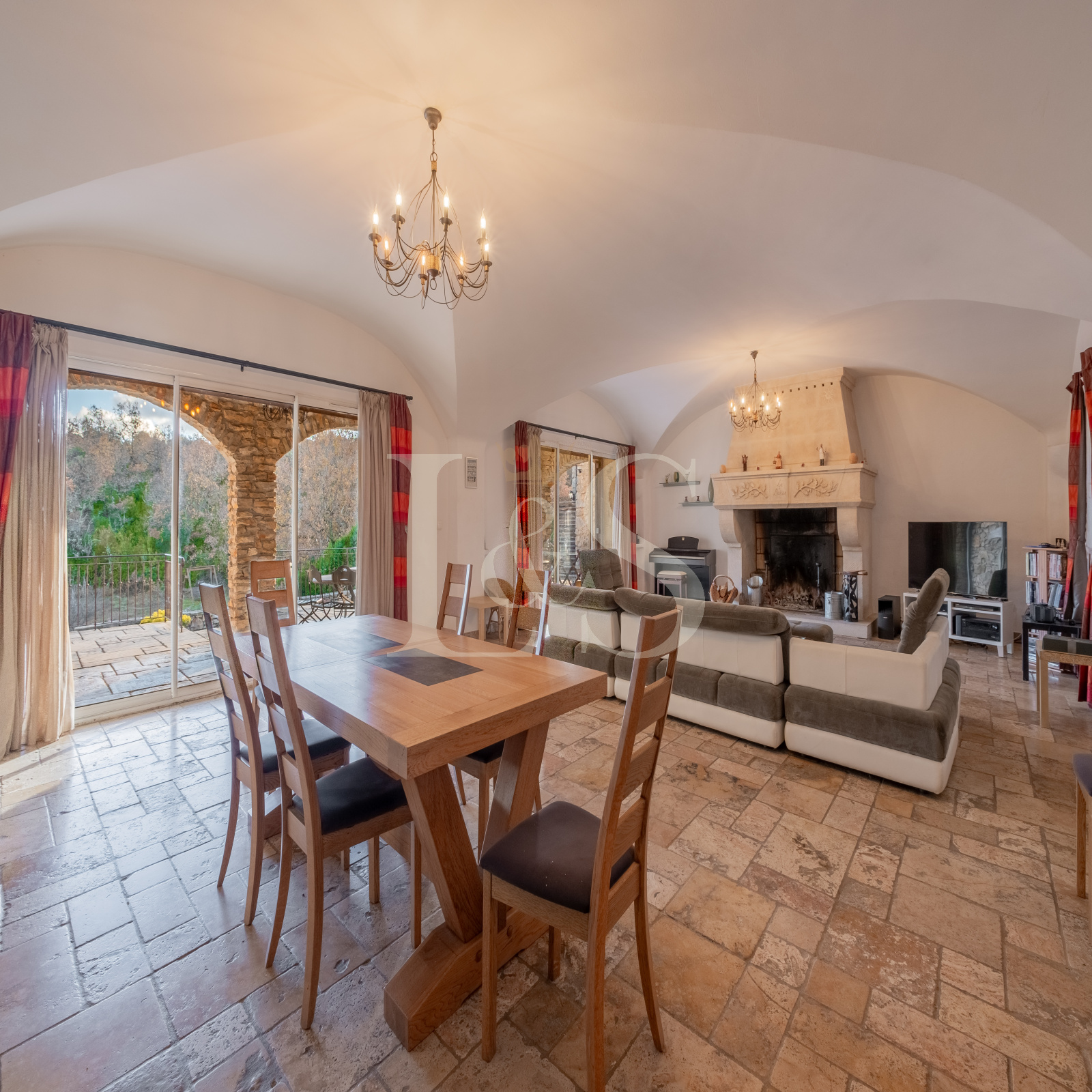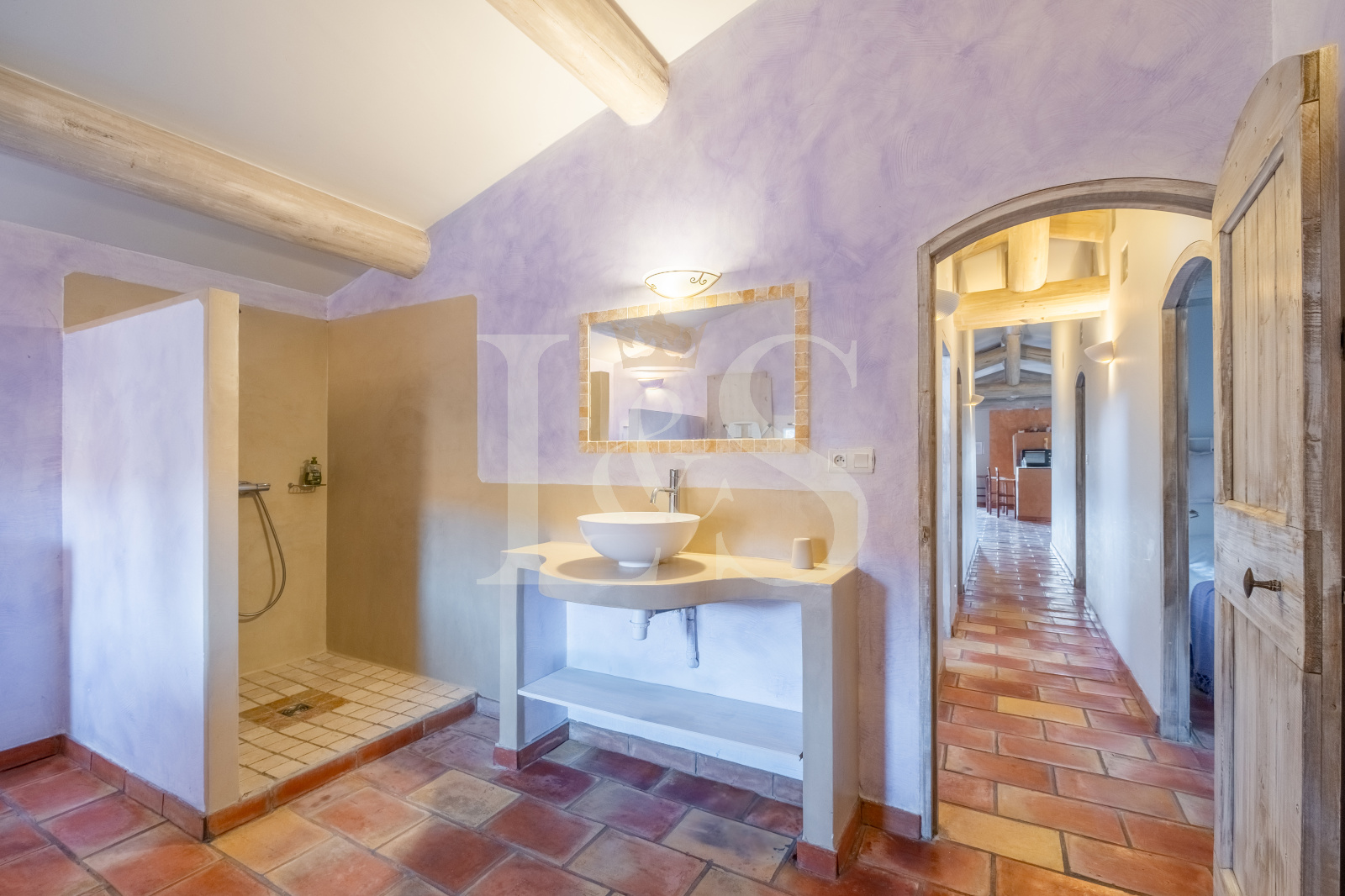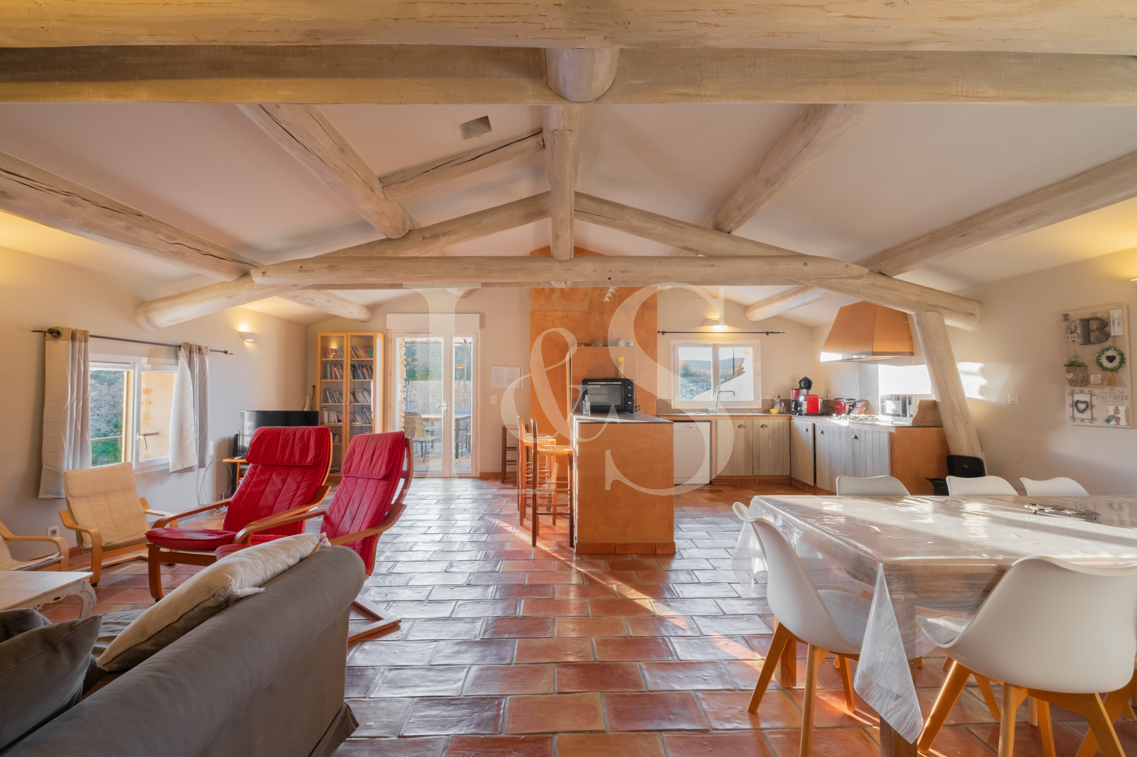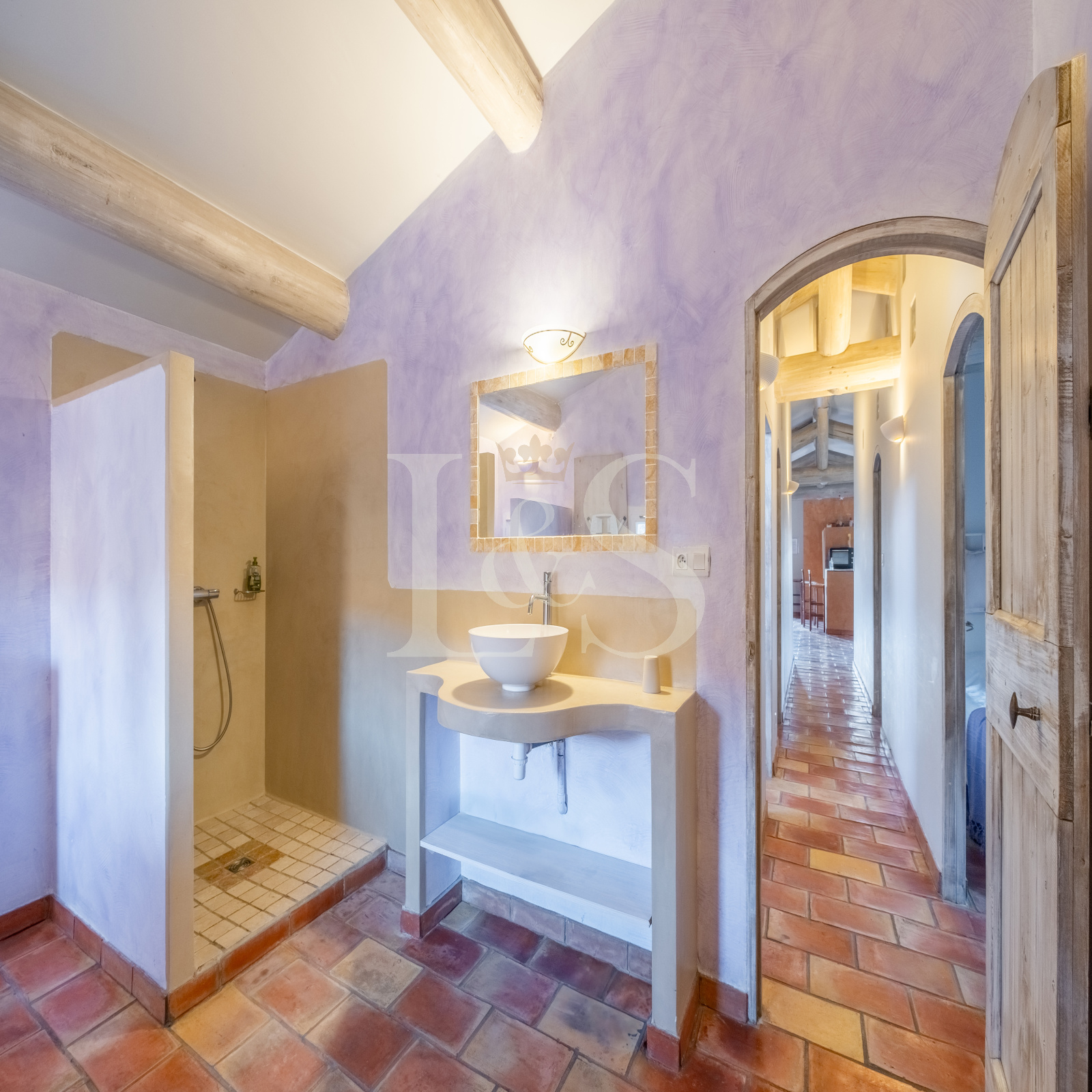 La bastide principale se distingue par un séjour lumineux de 82 m², agrémenté de baies vitrées et d’une cheminée en pierres de Banon, créant une ambiance chaleureuse. Une vaste cuisine de 32 m², équipée d’un piano de cuisson à gaz et d’un four à pizza, complète cet espace convivial. Cette partie de la maison inclut également une chambre, un bureau, une salle de bains avec WC, et un dressing.