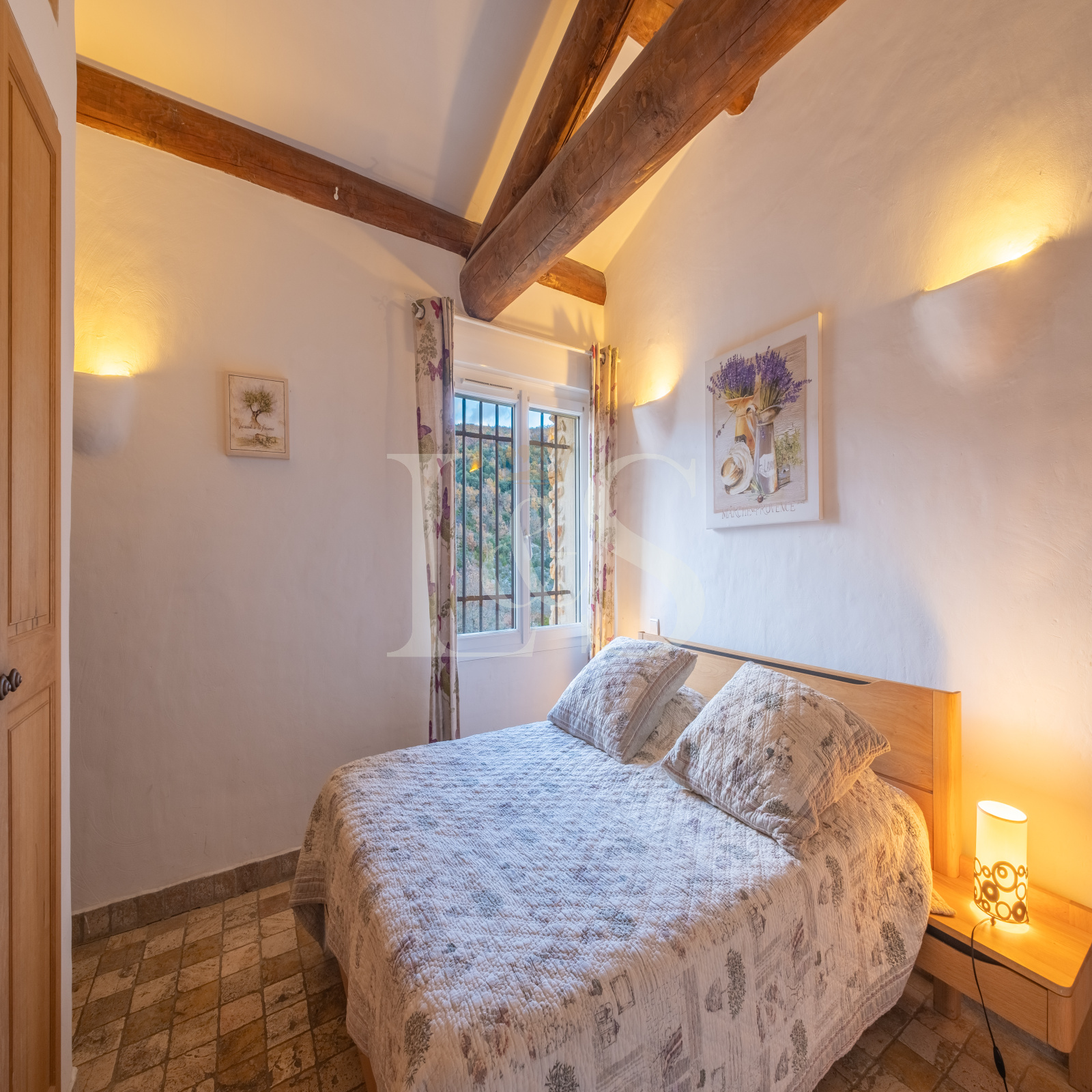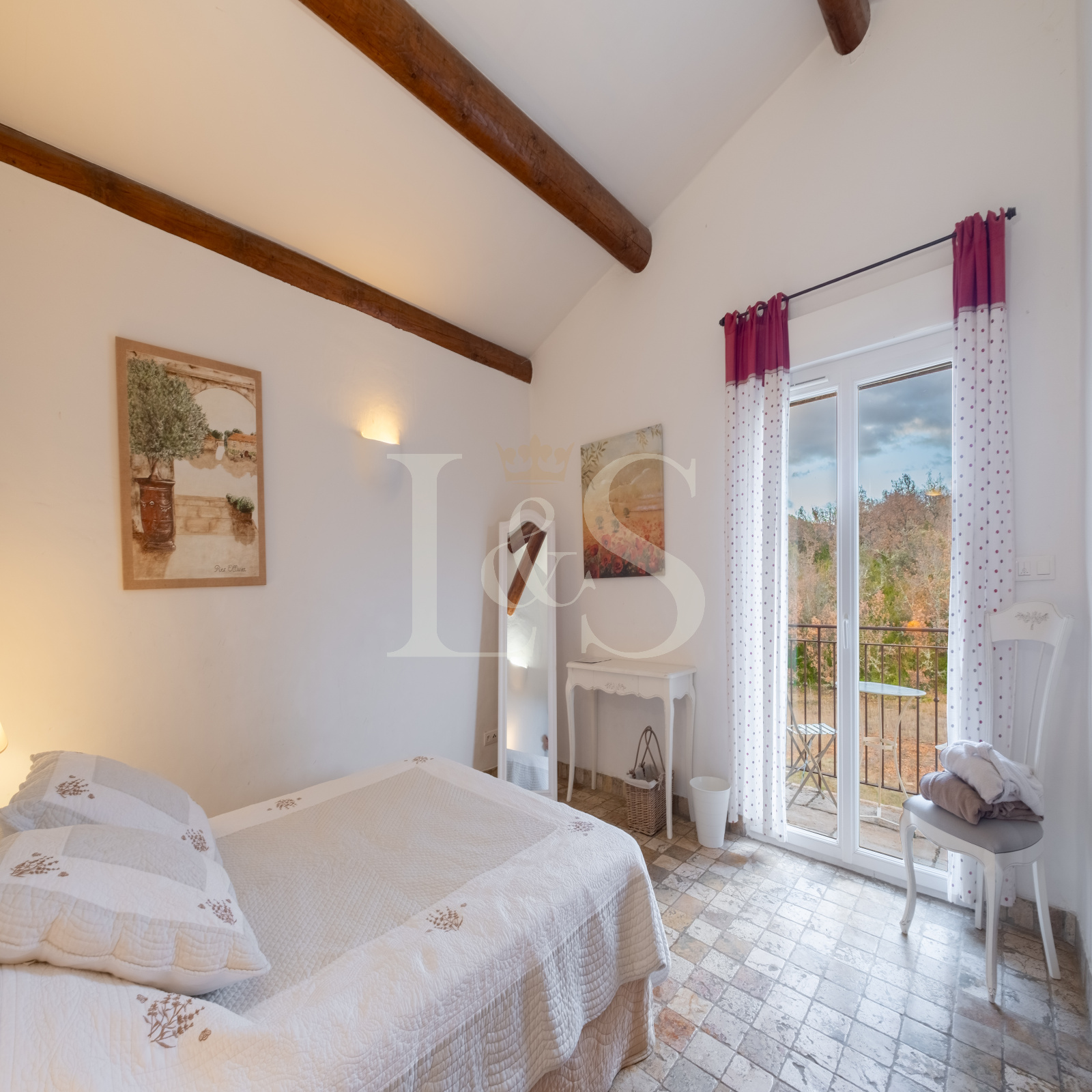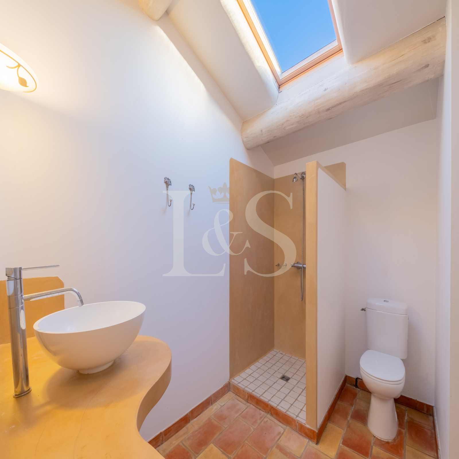 La bastide principale se distingue par un séjour lumineux de 82 m², agrémenté de baies vitrées et d’une cheminée en pierres de Banon, créant une ambiance chaleureuse. Une vaste cuisine de 32 m², équipée d’un piano de cuisson à gaz et d’un four à pizza, complète cet espace convivial. Cette partie de la maison inclut également une chambre, un bureau, une salle de bains avec WC, et un dressing.