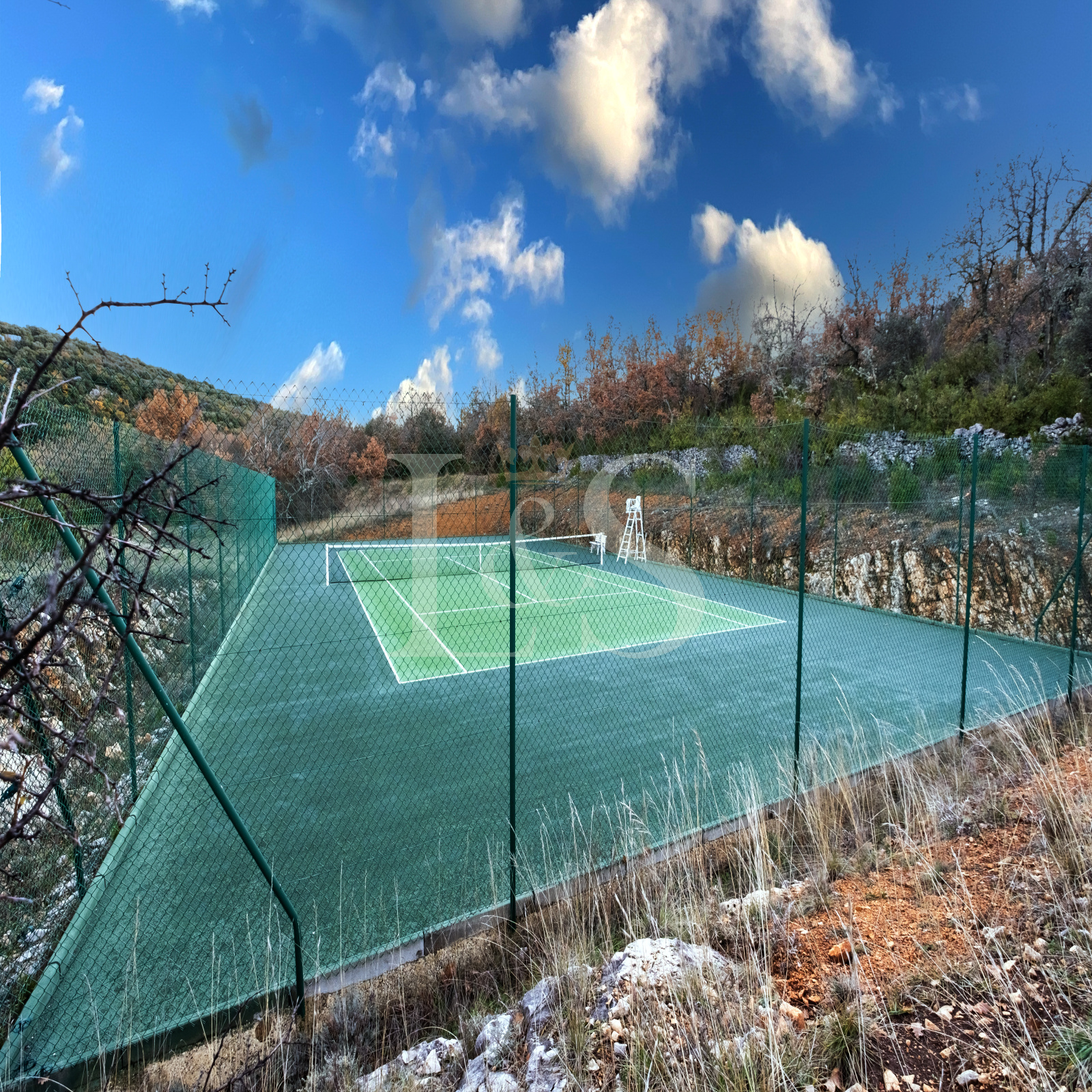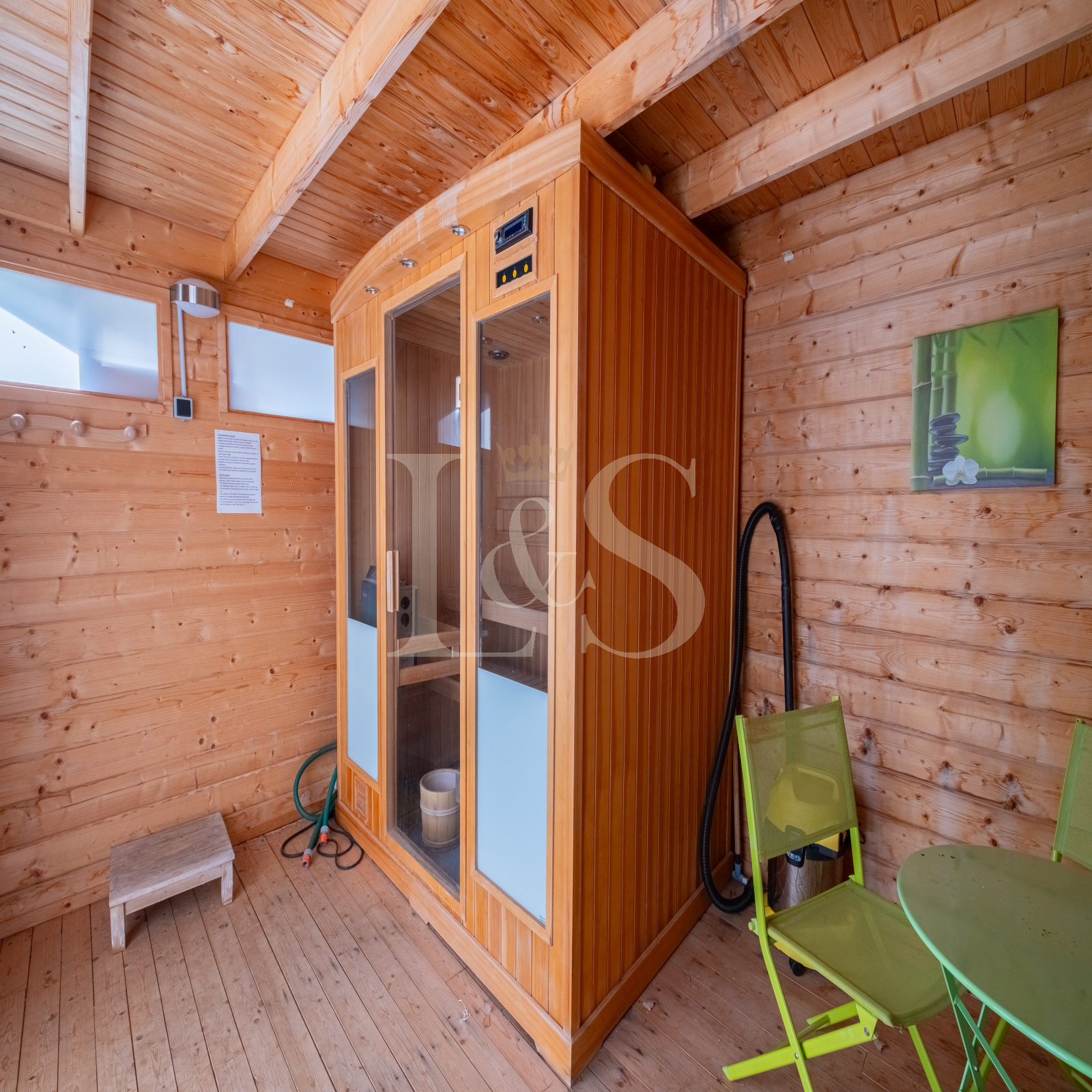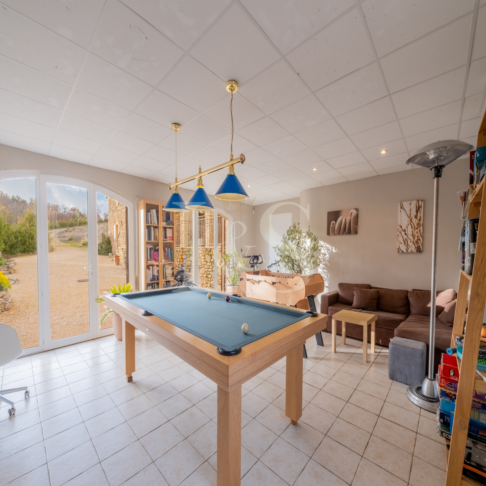 La bastide comprend deux terrasses, dont une couverte de 84 m² et une autre de 16 m², offrant une vue imprenable sur la nature environnante. Les installations extérieures incluent une piscine chauffée, un jacuzzi 6 places, un sauna, un terrain de pétanque, un court de tennis, une aire de jeux pour enfants et un garage.
