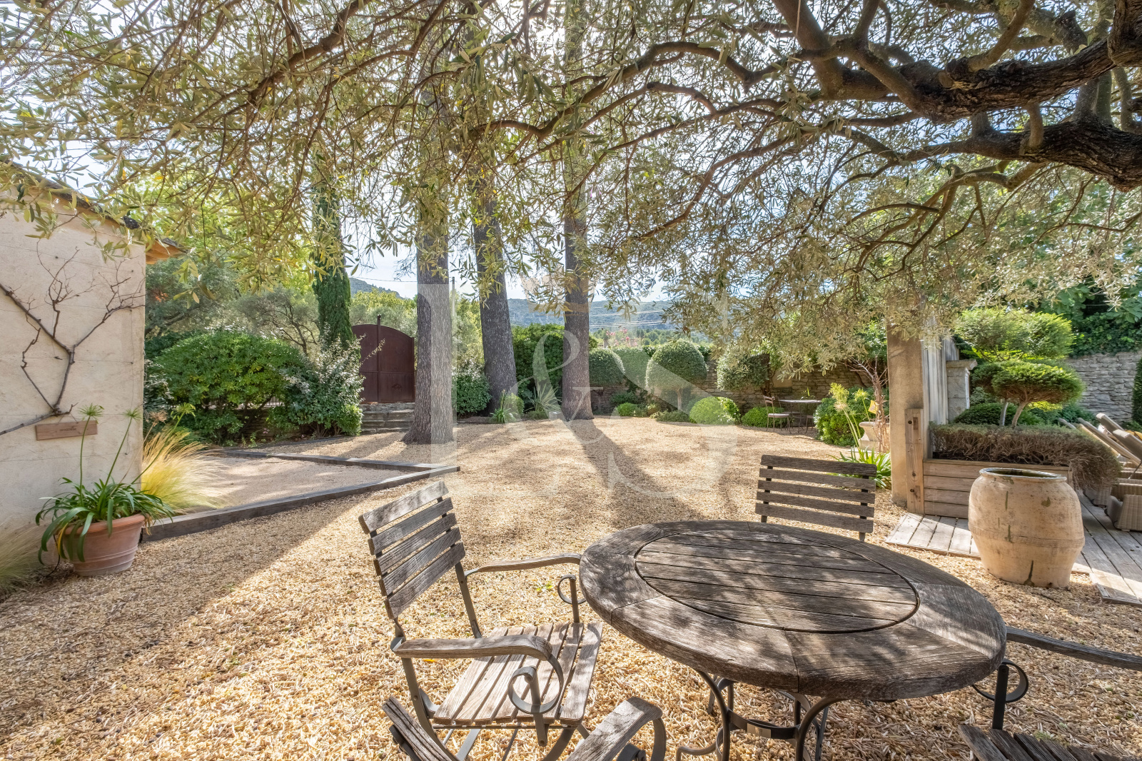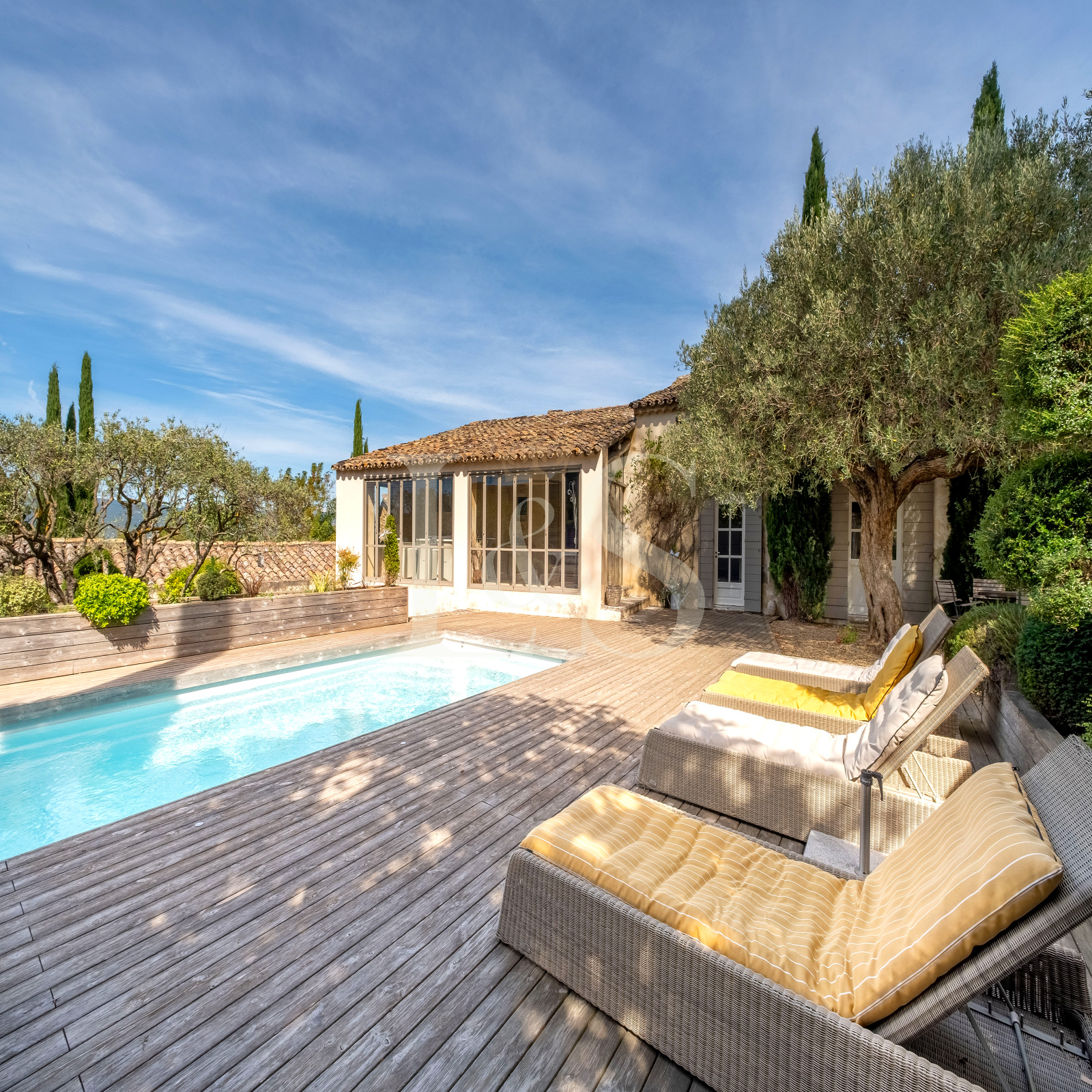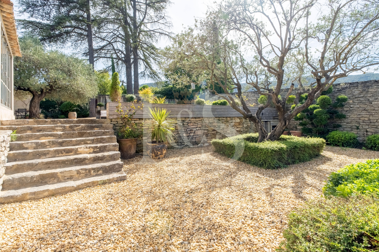 Lieu propice à la détente, aux réceptions comme aux instants de quiétude, le jardin de 553 m², clos de murs en pierre a été paysagé avec soin pour offrir des ambiances variées et élégantes : cèdres centenaires apportant fraîcheur et ombrage, terrasse en bois autour de la piscine sécurisée, petit jardin à la française, cour intime devant la chambre indépendante, et vaste parking couvert.