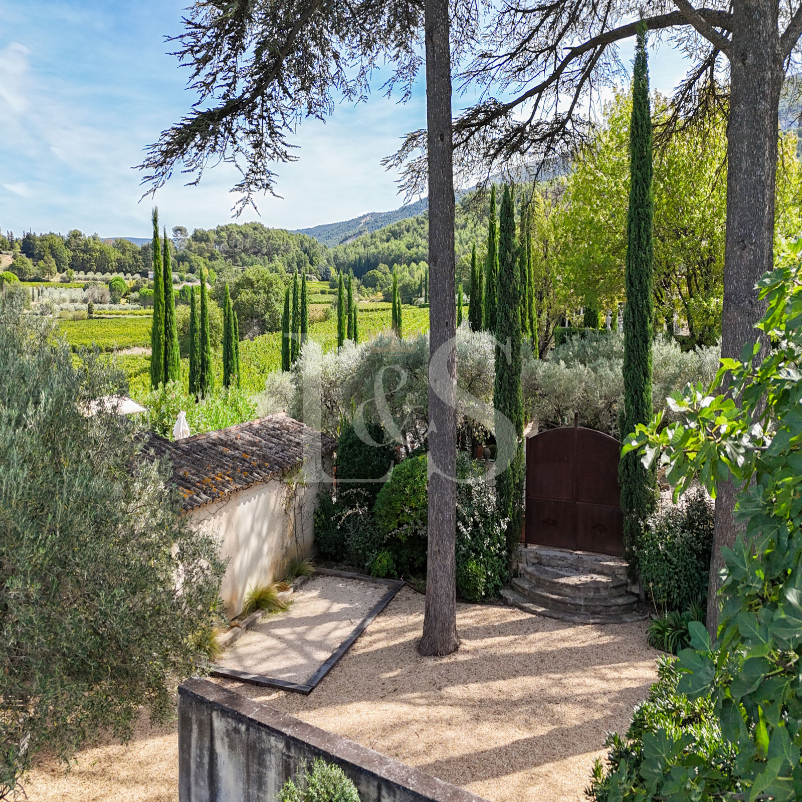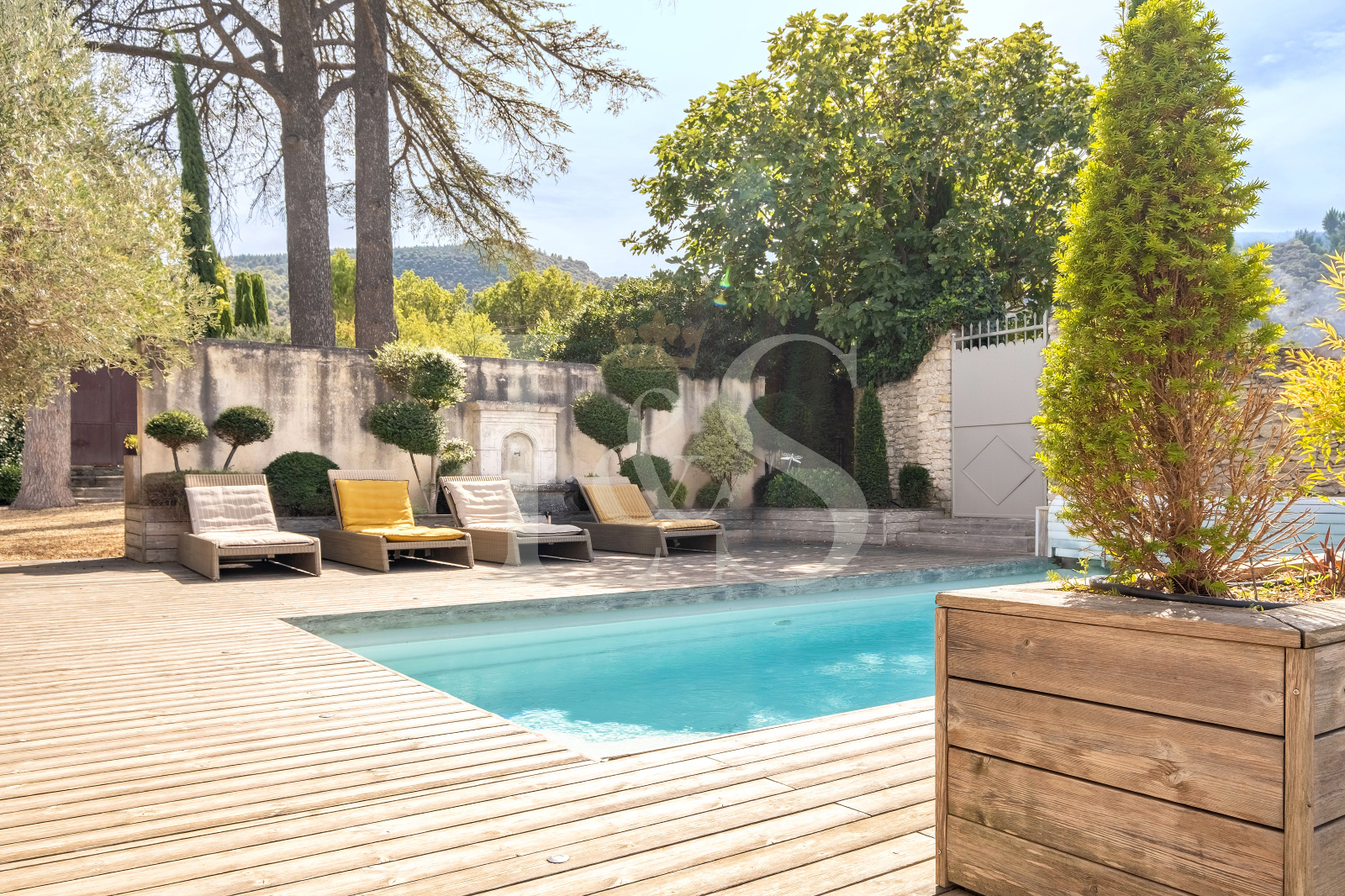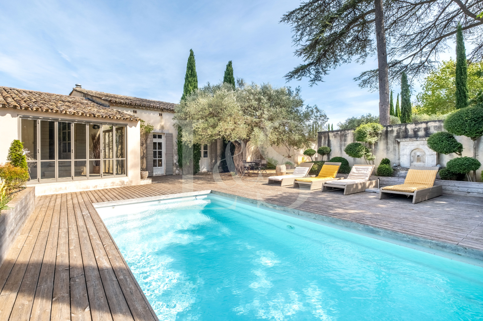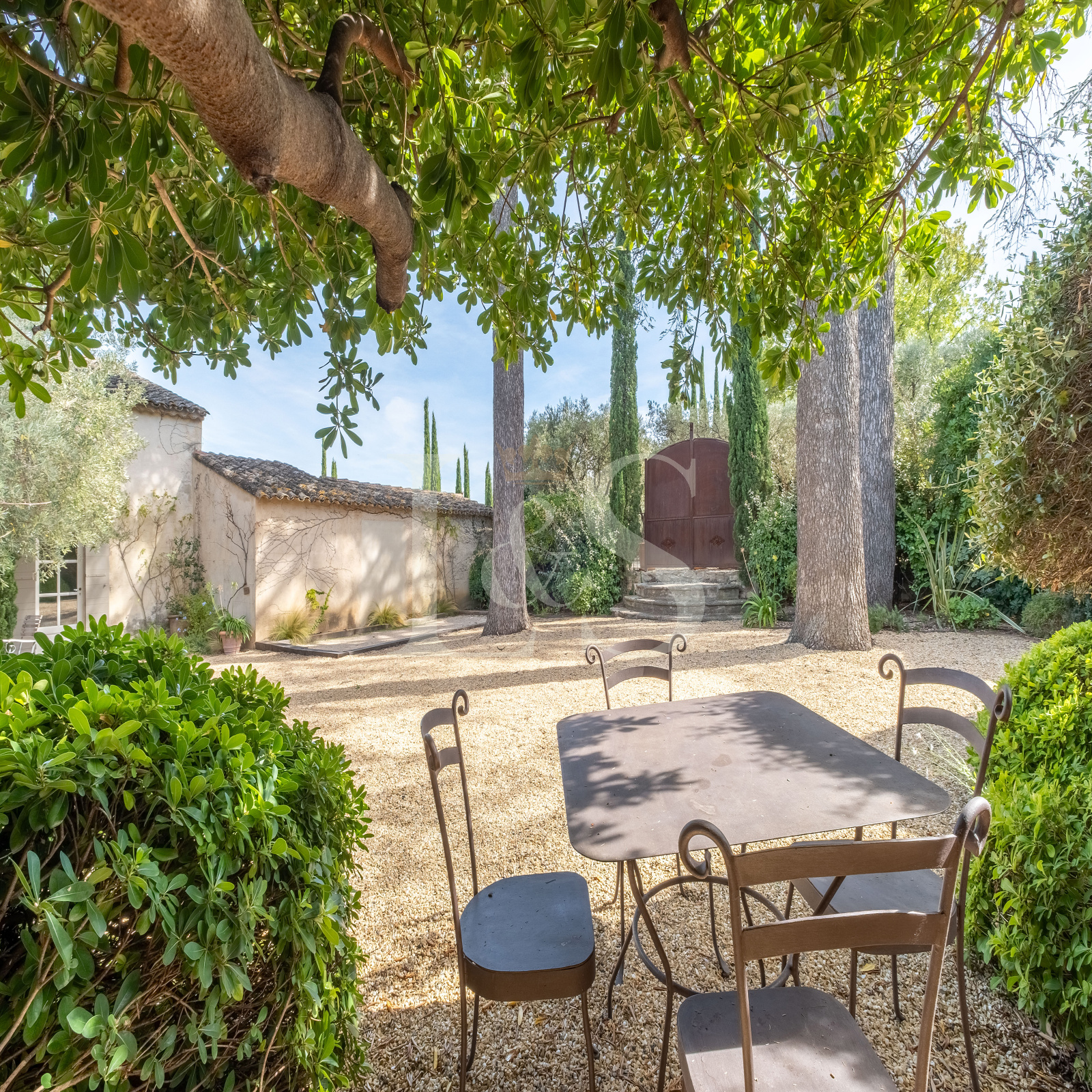 Lieu propice à la détente, aux réceptions comme aux instants de quiétude, le jardin de 553 m², clos de murs en pierre a été paysagé avec soin pour offrir des ambiances variées et élégantes : cèdres centenaires apportant fraîcheur et ombrage, terrasse en bois autour de la piscine sécurisée, petit jardin à la française, cour intime devant la chambre indépendante, et vaste parking couvert.