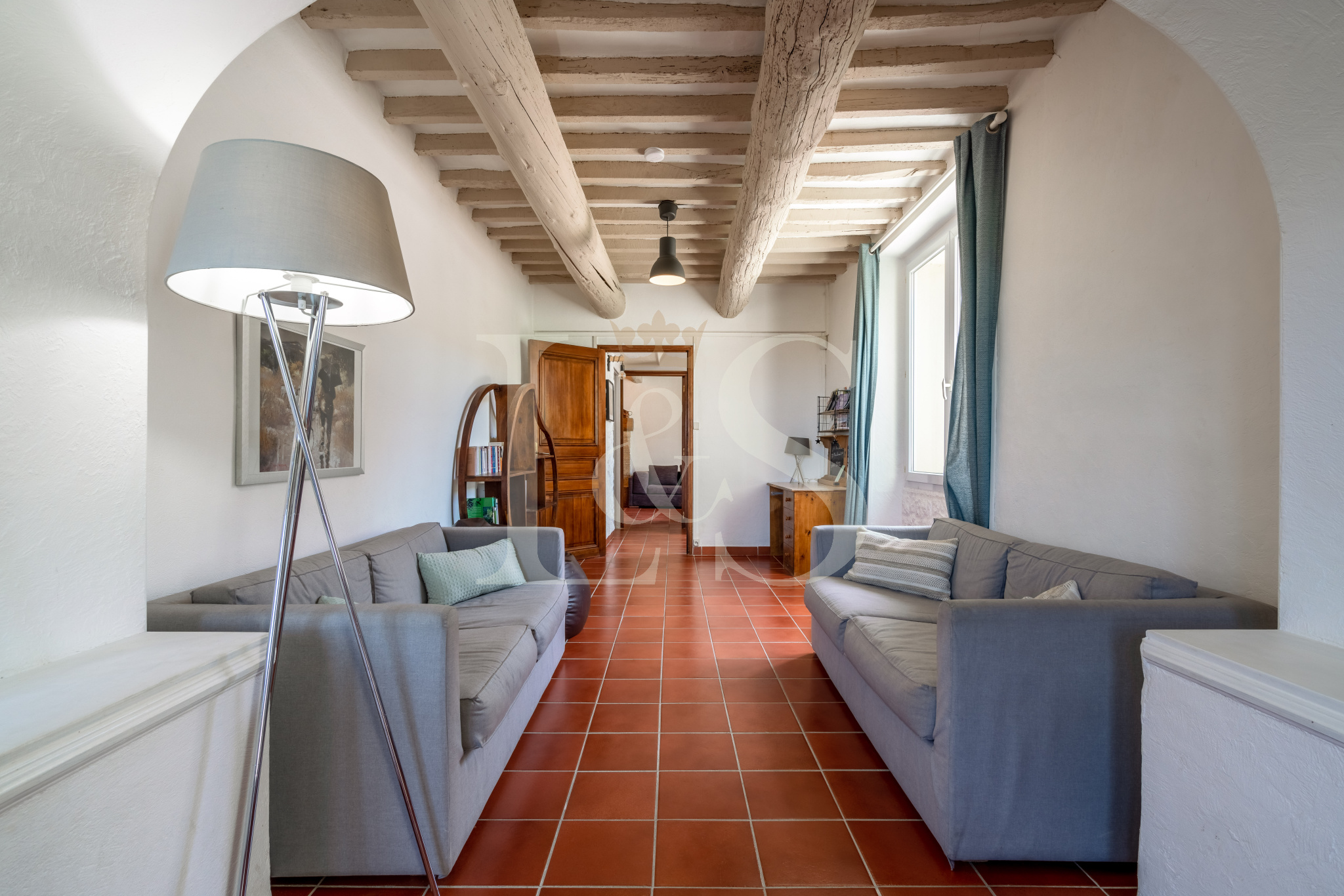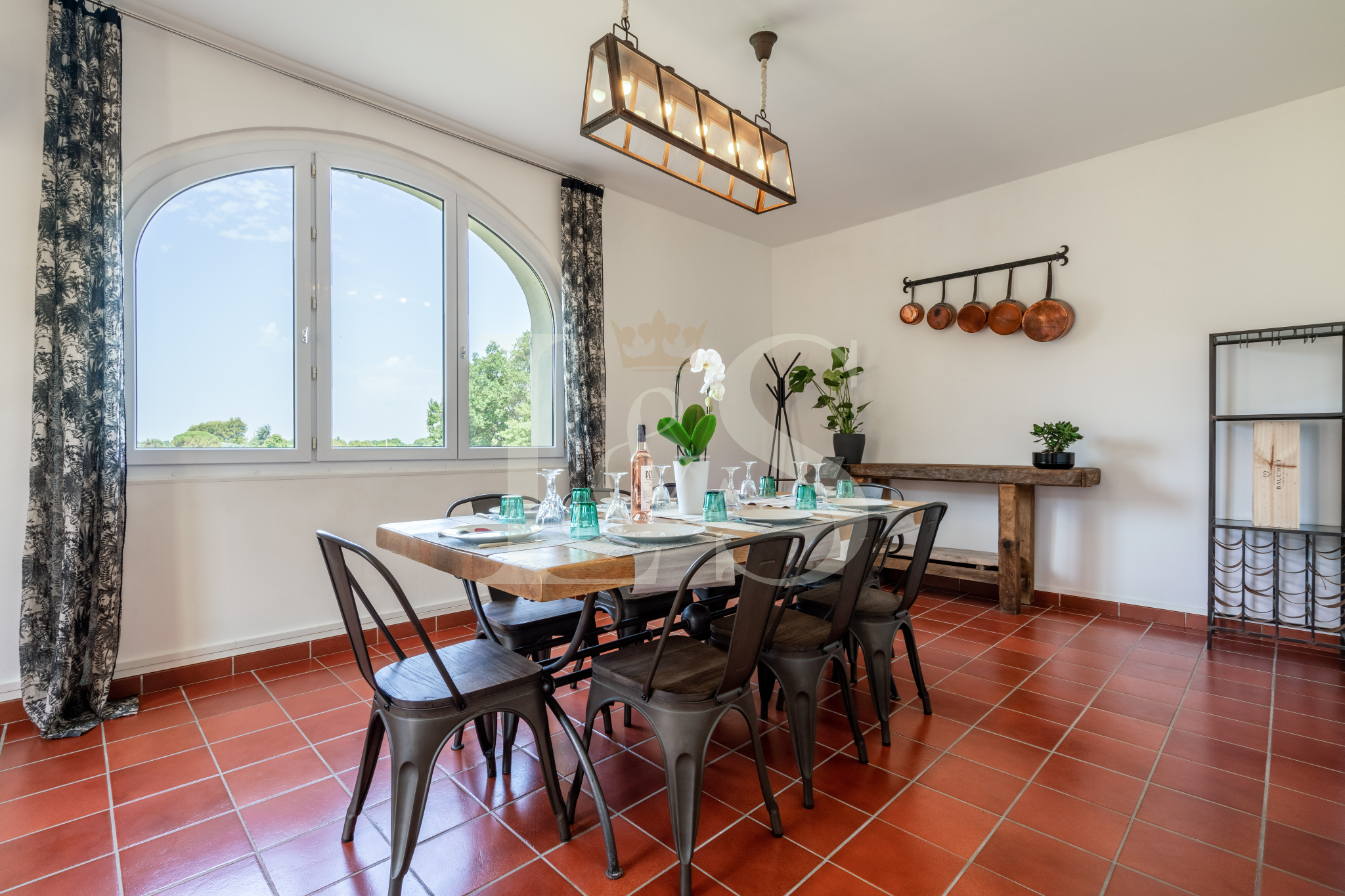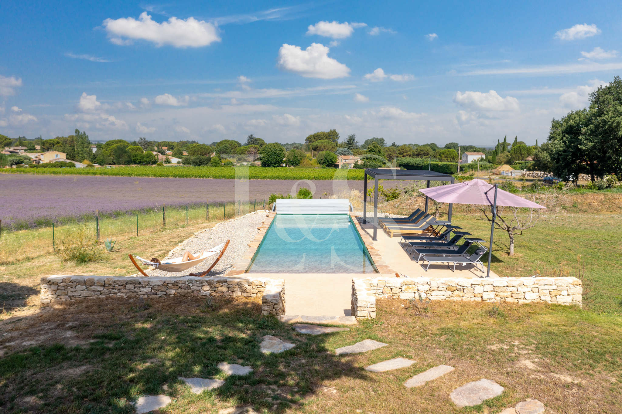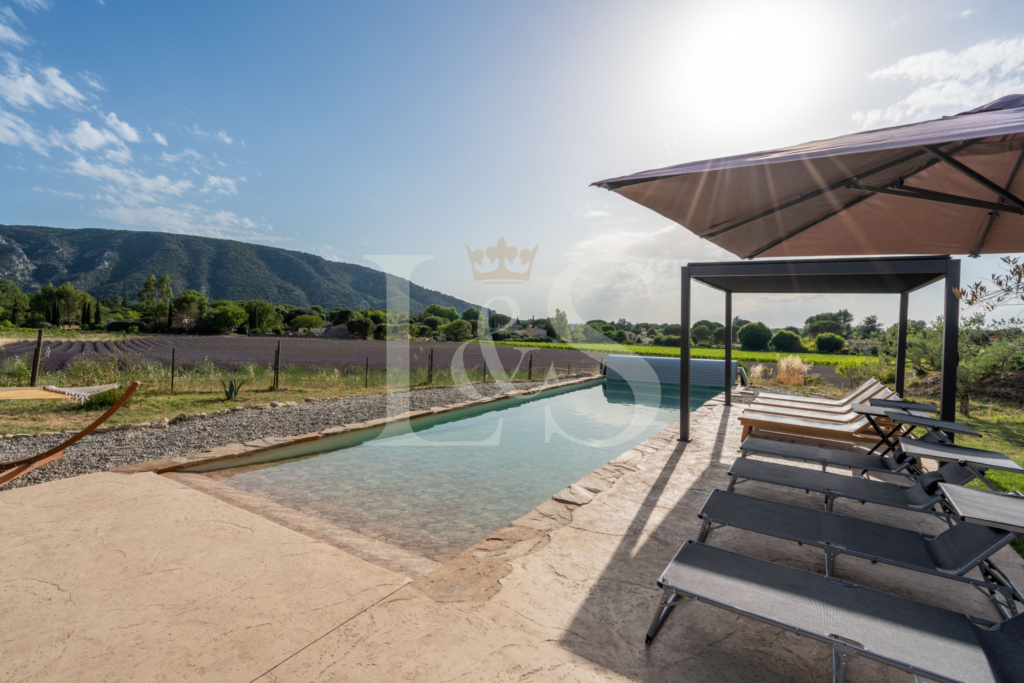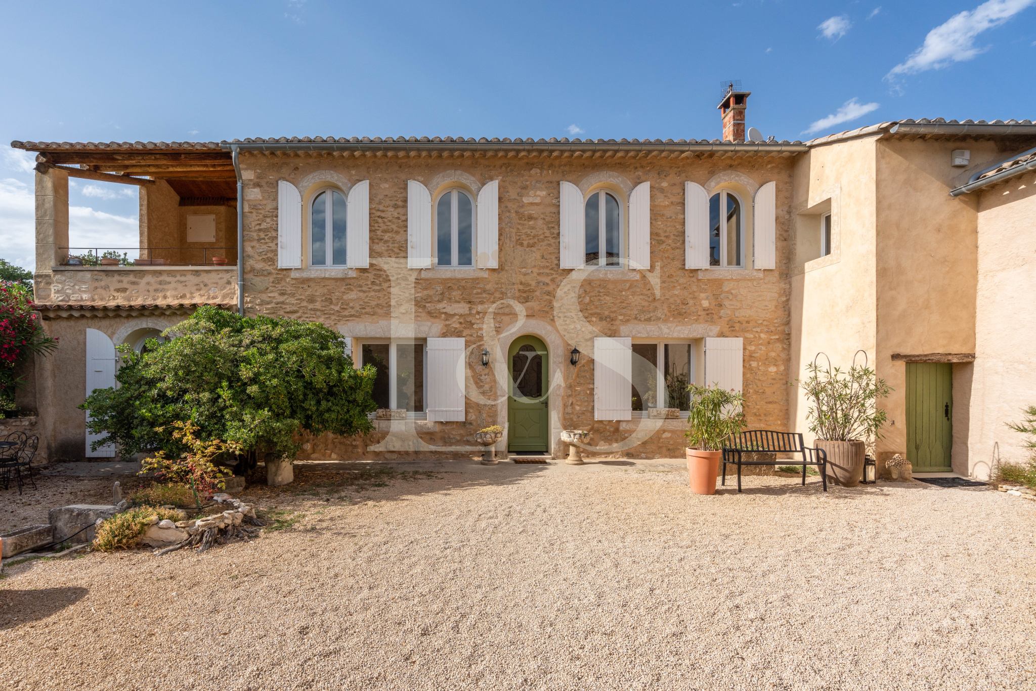 Le jardin paysager de 7 800 m², entièrement clos, bénéficie de deux accès (dont un par portail automatique) et permet de profiter pleinement de la vue sur le Luberon et les champs environnants. La propriété est mitoyenne d’un seul côté, sans gêne, et une cour intérieure permet de bien distinguer et séparer les deux habitations, ce qui en fait un bien idéal pour une grande famille, un projet d’accueil ou de maison d’hôtes.