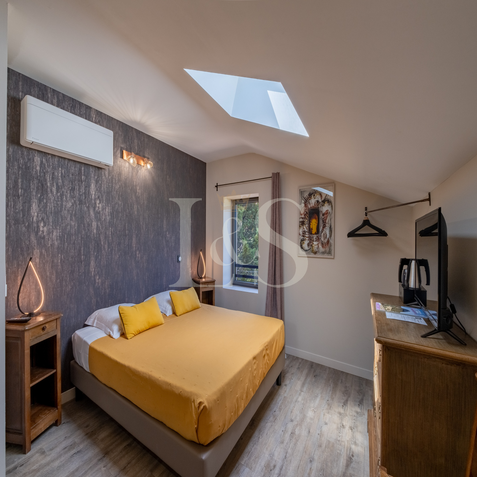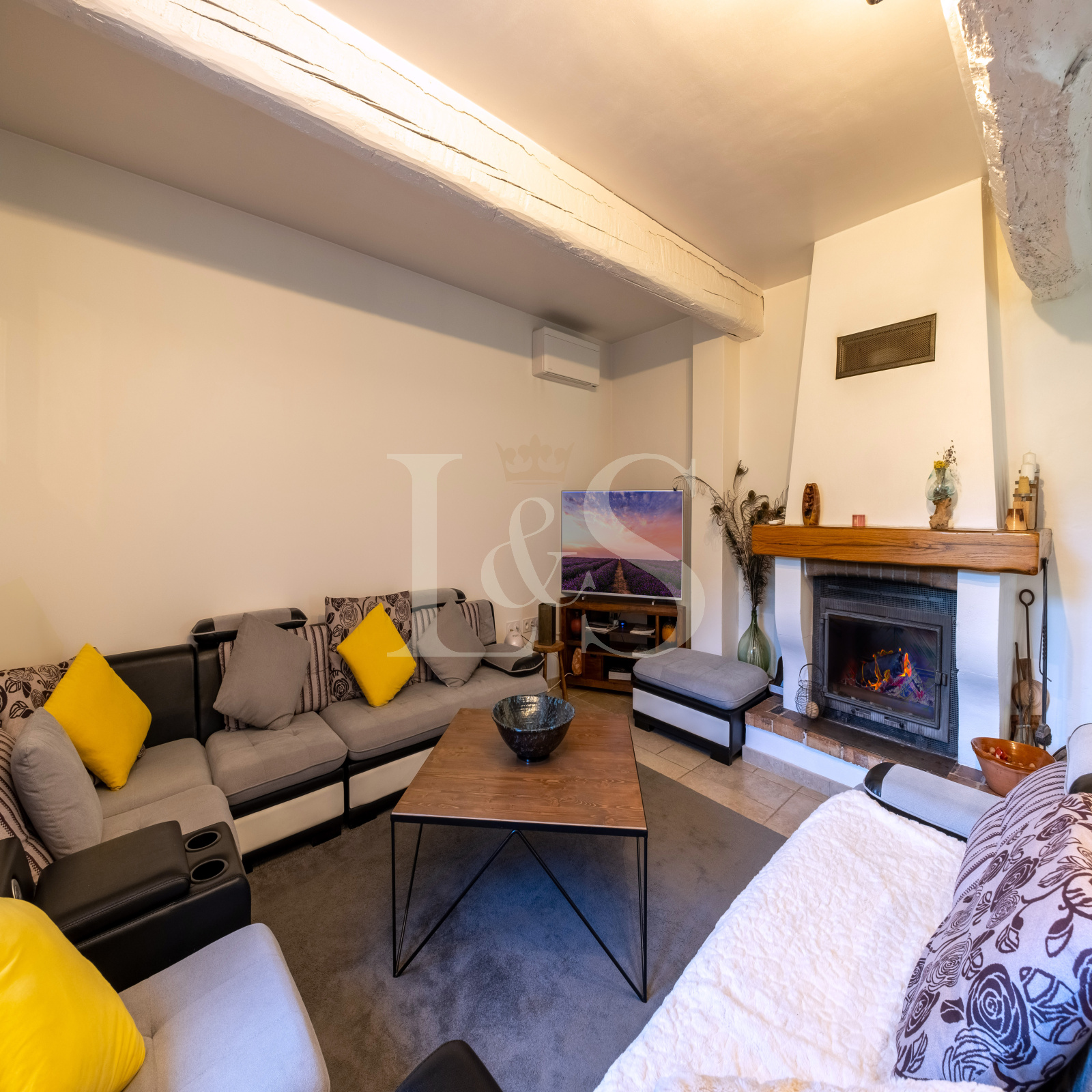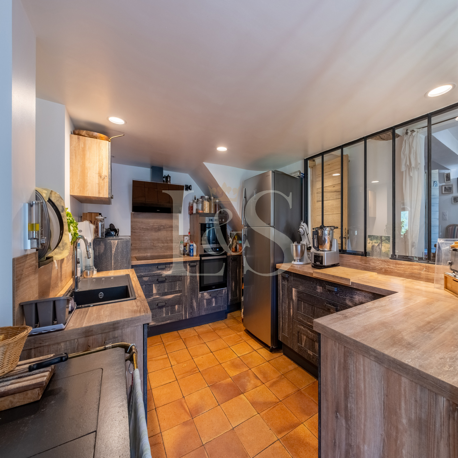 La seconde partie du mas, située au premier étage et accessible de manière indépendante, se compose d’une cuisine équipée ouvrant sur un séjour accueillant, d'une grande véranda avec un four à pizza, offrant une vue imprenable sur le terrain et le village voisin. On y trouve également une chambre, une buanderie, une salle d'eau et un WC.